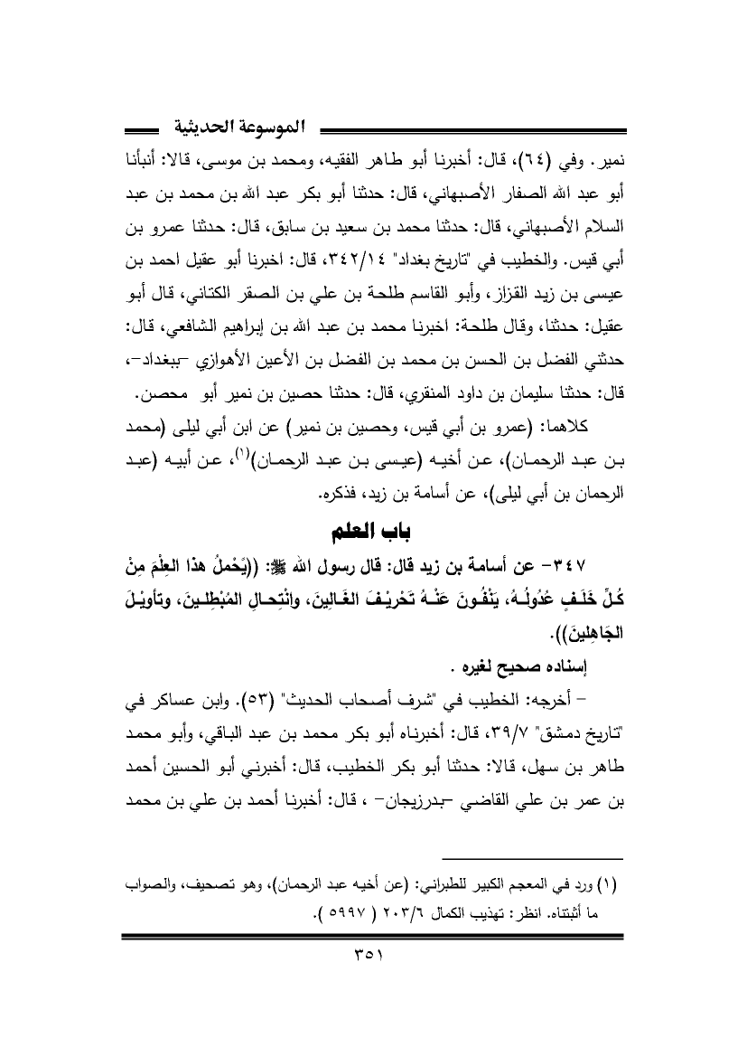 ٣٤٧ - عن أسامة بن زيد قال: قال رسول الله -صَلَّى اللهُ عَلَيْهِ وَسَلَّمَ-: ((يَحْملُ هذا العِلْمَ مِنْ كُلِّ خَلَفٍ عُدُولُهُ، يَنْفُونَ عَنْهُ تَحْريفَ الغَالِينَ، وانْتِحالِ المُبْطِلينَ، وتأويلَ الجَاهِلينَ)).
