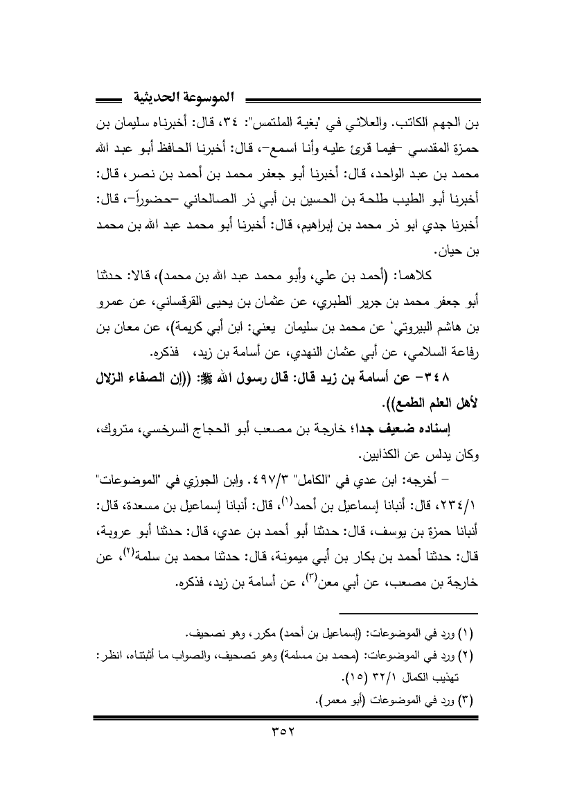 ٣٤٨ - عن أسامة بن زيد قال: قال رسول الله -صَلَّى اللهُ عَلَيْهِ وَسَلَّمَ-: ((إن الصفاء الزلال لأهل العلم الطمع)).