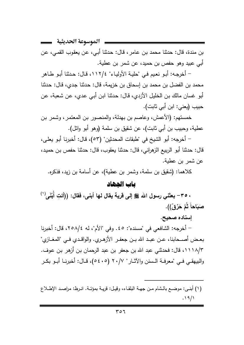٣٥٠ - بعثني رسول الله -صَلَّى اللهُ عَلَيْهِ وَسَلَّمَ- إلى قرية يقال لها أبنى، فقال: ((أئتِ أُبْنَى (¬١) صَبَاحًا ثُمَّ حَرِّقْ)).