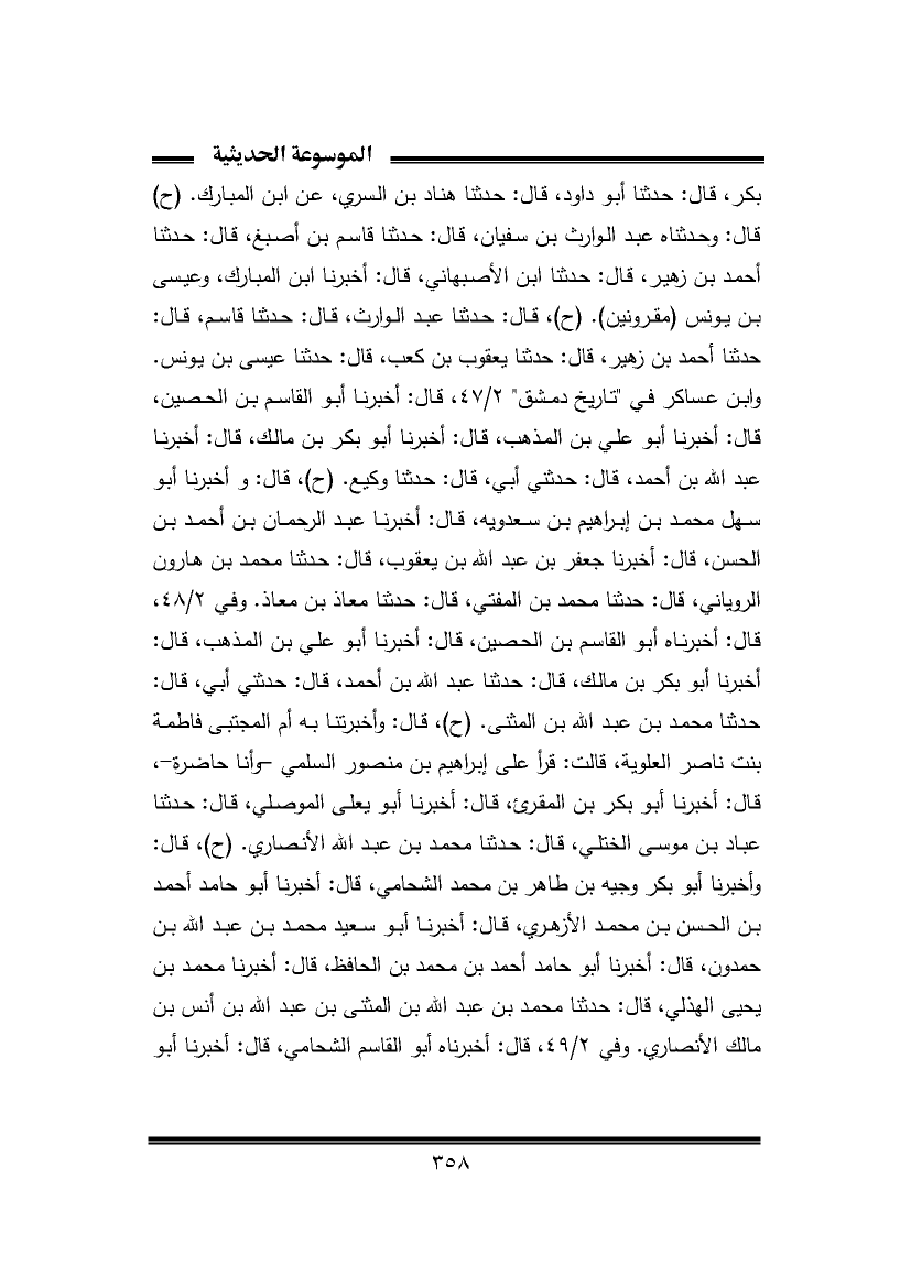 بكر، قال: حدثنا أبو داود، قال: حدثنا هناد بن السري، عن ابن المبارك. (ح) قال: وحدثناه عبد الوارث بن سفيان، قال: حدثنا قاسم بن أصبغ، قال: حدثنا أحمد بن زهير، قال: حدثنا ابن الأصبهاني، قال: أخبرنا ابن المبارك، وعيسى بن يونس (مقرونين). (ح)، قال: حدثنا عبد الوارث، قال: حدثنا قاسم، قال: حدثنا أحمد بن زهير، قال: حدثنا يعقوب بن كعب، قال: حدثنا عيسى بن يونس. وابن عساكر في "تاريخ دمشق" ٢/ ٤٧، قال: أخبرنا أبو القاسم بن الحصين، قال: أخبرنا أبو علي بن المذهب، قال: أخبرنا أبو بكر بن مالك، قال: أخبرنا عبد الله بن أحمد، قال: حدثني أبي، قال: حدثنا وكيع. (ح)، قال: وأخبرنا أبو سهل محمد بن إبراهيم بن سعدويه، قال: أخبرنا عبد الرحمان بن أحمد بن الحسن، قال: أخبرنا جعفر بن عبد الله بن يعقوب، قال: حدثنا محمد بن هارون الروياني، قال: حدثنا محمد بن المفتي، قال: حدثنا معاذ بن معاذ. وفي ٢/ ٤٨، قال: أخبرناه أبو القاسم بن الحصين، قال: أخبرنا أبو علي بن المذهب، قال: أخبرنا أبو بكر بن مالك، قال: حدثنا عبد الله بن أحمد، قال: حدثني أبي، قال: حدثنا محمد بن عبد الله بن المثنى. (ح)، قال: وأخبرتنا به أم المجتبى فاطمة بنت ناصر العلوية، قالت: قرأ على إبراهيم بن منصور السلمي -وأنا حاضرة-، قال: أخبرنا أبو بكر بن المقرئ، قال: أخبرنا أبو يعلى الموصلي، قال: حدثنا عباد بن موسى الختلي، قال: حدثنا محمد بن عبد الله الأنصاري. (ح)، قال: وأخبرنا أبو بكر وجيه بن طاهر بن محمد الشحامي، قال: أخبرنا أبو حامد أحمد بن الحسن بن محمد الأزهري، قال: أخبرنا أبو سعيد محمد بن عبد الله بن حمدون، قال: أخبرنا أبو حامد أحمد بن محمد بن الحافظ، قال: أخبرنا محمد بن يحيى الهذلي، قال: حدثنا محمد بن عبد الله بن المثنى بن عبد الله بن أنس بن مالك الأنصاري. وفي ٢/ ٤٩، قال: أخبرناه أبو القاسم الشحامي، قال: أخبرنا أبو