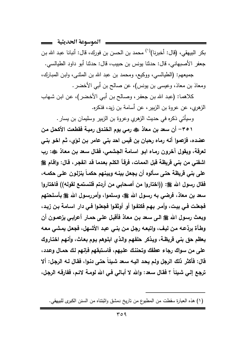 ٣٥١ - أن سعد بن معاذ -رَضِيَ اللهُ عَنْهُ- رمي يوم الخندق رمية فقطعت الأكحل من عضده، فزعموا أنه رماه رحبان بن قيس أحد بني عامر بن لؤي، ثم أخو بني لعرقة، ويقول آخرون رماه أبو أسامة الجشمي، فقال سعد بن معاذ -رَضِيَ اللهُ عَنْهُ-: رب اشفني من بني قريظة قبل الممات، فرقأ الكلم بعدما قد انفجر، قال: وأقام -صَلَّى اللهُ عَلَيْهِ وَسَلَّمَ- على بني قريظة حتى سألوه أن يجعل بينه ويينهم حكمًا ينزلون على حكمه، فقال رسول الله -صَلَّى اللهُ عَلَيْهِ وَسَلَّمَ-: ((اختاروا من أصحابي من أردتم فلنستمع لقوله)) فاختاروا سعد بن معاذ، فرضي به رسول الله -صَلَّى اللهُ عَلَيْهِ وَسَلَّمَ-، وسلموا، وأمر رسول الله -صَلَّى اللهُ عَلَيْهِ وَسَلَّمَ- بأسلحتهم فجعلت في بيت، وأمر بهم فكتفوا أو أوثقوا فجعلوا في دار أسامة بن زيد، وبعث رسول الله -صَلَّى اللهُ عَلَيْهِ وَسَلَّمَ- إلى سعد بن معاذ فأقبل على حمار أعرابي يزعمون أن وطأة برذعه من ليف، واتبعه رجل من بني عبد الأشهل، فجعل يمشي معه يعظم حق بني قريظة، ويذكر حلفهم والذي أبلوهم يوم بعاث، وأنهم اختاروك على من سواك رجاء عطفك وتحننك عليهم، فاستبقهم فإنهم لك حمال وعدد، قال: فأكثر ذلك الرجل ولم يحد إليه سعد شيئًا حتى دنوا، فقال له الرجل: ألا ترجع إلي شيئًا؟ فقال سعد: والله لا أبالي في الله لومة لائم، ففارقه الرجل،