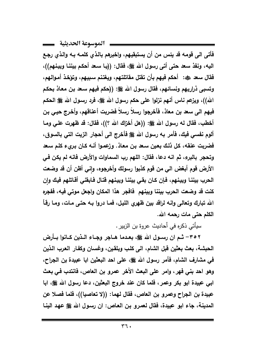 ٣٥٢ - ثم إن رسول الله -صَلَّى اللهُ عَلَيْهِ وَسَلَّمَ-، بعدما هاجر وجاء الذين كانوا بأرض الحبشة، بعث بعثين قبل الشام، إلى كلب وبلقين، وغسان وكفار العرب الذين في مشارف الشام، فأمر رسول الله -صَلَّى اللهُ عَلَيْهِ وَسَلَّمَ-، على أحد البعثين أبا عبيدة بن الجراح، وهو أحد بني فهر، وأمر على البعث الآخر عمرو بن العاص، فانتدب في بعث أبي عبيدة أبو بكر وعمر، فلما كان عند خروج البعثين، دعا رسول الله -صَلَّى اللهُ عَلَيْهِ وَسَلَّمَ-، أبا عبيدة بن الجراح وعمرو بن العاص، فقال لهما: ((لا تعاصيا))، فلما فصلا عن المدينة، جاء أبو عبيدة، فقال لعمرو بن العاص: أن رسول الله -صَلَّى اللهُ عَلَيْهِ وَسَلَّمَ- عهد إلينا
