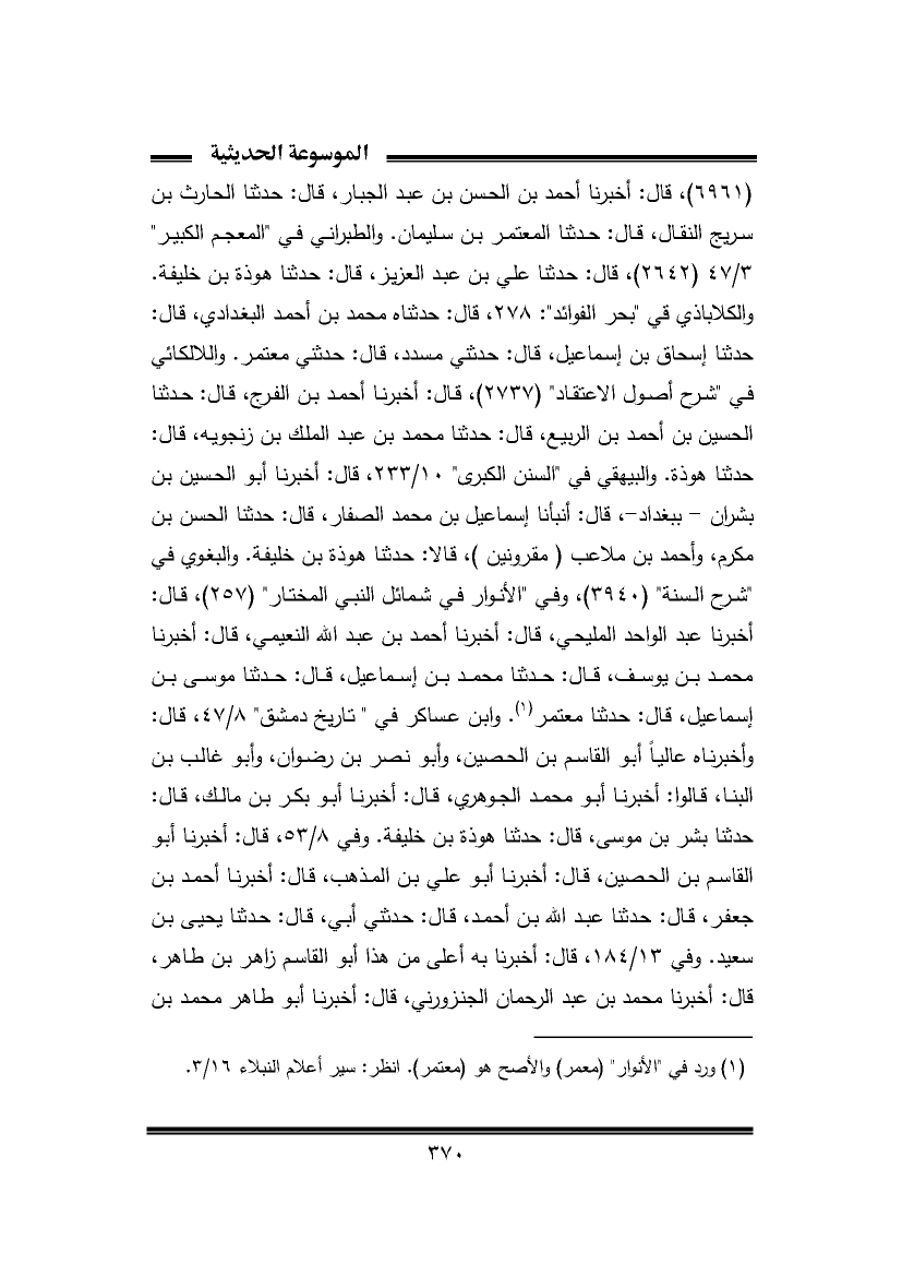 (¬١) ورد في "الأنوار" (معمر) والأصح هو (معتمر). انظر: سير أعلام النبلاء ١٦/ ٣.