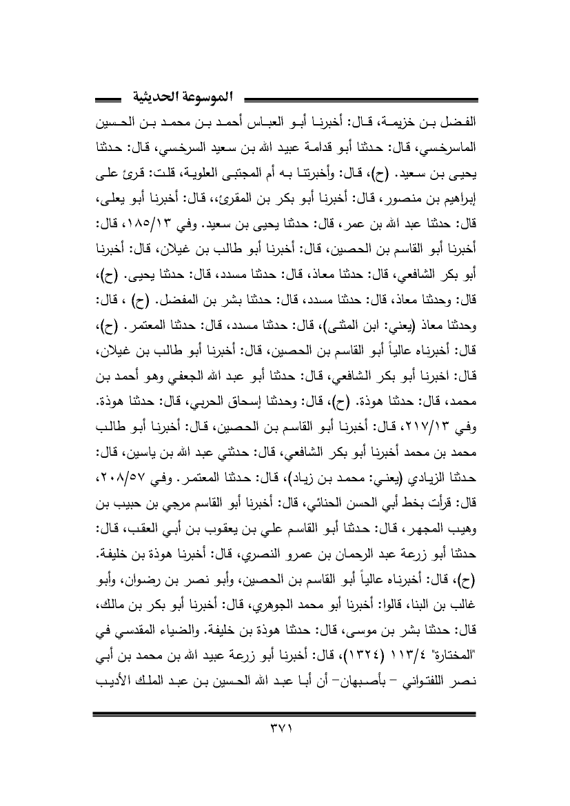 الفضل بن خزيمة، قال: أخبرنا أبو العباس أحمد بن محمد بن الحسين الماسرخسي، قال: حدثنا أبو قدامة عبيد الله بن سعيد السرخسي، قال: حدثنا يحيى بن سعيد. (ح)، قال: وأخبرتنا به أم المجتبى العلوية، قلت: قرئ على إبراهيم بن منصور، قال: أخبرنا أبو بكر بن المقرئ، قال: أخبرنا أبو يعلى، قال: حدثنا عبد الله بن عمر، قال: حدثنا يحيى بن سعيد. وفي ١٣/ ١٨٥، قال: أخبرنا أبو القاسم بن الحصين، قال: أخبرنا أبو طالب بن غيلان، قال: أخبرنا أبو بكر الشافعي، قال: حدثنا معاذ، قال: حدثنا مسدد، قال: حدثنا يحيى. (ح)، قال: وحدثنا معاذ، قال: حدثنا مسدد، قال: حدثنا بشر بن المفضل. (ح)، قال: وحدثنا معاذ (يعني: ابن المثنى)، قال: حدثنا مسدد، قال: حدثنا المعتمر. (ح)، قال: أخبرناه عاليًا أبو القاسم بن الحصين، قال: أخبرنا أبو طالب بن غيلان، قال: أخبرنا أبو بكر الشافعي، قال: حدثنا أبو عبد الله الجعفي وهو أحمد بن محمد، قال: حدثنا هوذة. (ح)، قال: وحدثنا إسحاق الحربي، قال: حدثنا هوذة. وفي ١٣/ ٢١٧، قال: أخبرنا أبو القاسم بن الحصين، قال: أخبرنا أبو طالب محمد بن محمد أخبرنا أبو بكر الشافعي، قال: حدثني عبد الله بن ياسين، قال: حدثنا الزيادي (يعني: محمد بن زياد)، قال: حدثنا المعتمر. وفي ٥٧/ ٢٠٨، قال: قرأت بخط أبي الحسن الحنائي، قال: أخبرنا أبو القاسم مرجي بن حبيب بن وهيب المجهر، قال: حدثنا أبو القاسم علي بن يعقوب بن أبي العقب، قال: حدثنا أبو زرعة عبد الرحمان بن عمرو النصري، قال: أخبرنا هوذة بن خليفة. (ح)، قال: أخبرناه عاليًا أبو القاسم بن الحصين، وأبو نصر بن رضوان، وأبو غالب بن البنا، قالوا: أخبرنا أبو محمد الجوهري، قال: أخبرنا أبو بكر بن مالك، قال: حدثنا بشر بن موسى، قال: حدثنا هوذة بن خليفة. والضياء المقدسي في "المختارة" ٤/ ١١٣ (١٣٢٤)، قال: أخبرنا أبو زرعة عبيد الله بن محمد بن أبي نصر اللفتواني -بأصبهان- أن أبا عبد الله الحسين بن عبد الملك الأديب