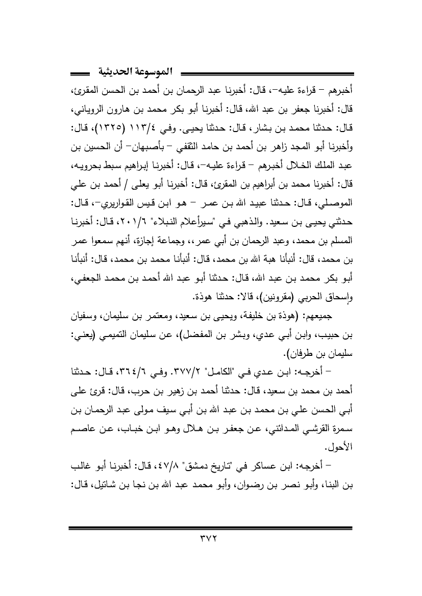 أخبرهم -قراءة عليه-، قال: أخبرنا عبد الرحمان بن أحمد بن الحسن المقرئ، قال: أخبرنا جعفر بن عبد الله، قال: أخبرنا أبو بكر محمد بن هارون الروياني، قال: حدثنا محمد بن بشار، قال: حدثنا يحيى. وفي ٤/ ١١٣ (١٣٢٥)، قال: وأخبرنا أبو المجد زاهر بن أحمد بن حامد الثقفي -بأصبهان- أن الحسين بن عبد الملك الخلال أخبرهم -قراءة عليه-، قال: أخبرنا إبراهيم سبط بحرويه، قال: أخبرنا محمد بن إبراهيم بن المقرئ، قال: أخبرنا أبو يعلى/ أحمد بن علي الموصلي، قال: حدثنا عبيد الله بن عمر -هو ابن قيس القواريري-، قال: حدثني يحيى بن سعيد. والذهبي في "سير أعلام النبلاء" ٦/ ٢٠١، قال: أخبرنا المسلم بن محمد، وعبد الرحمان بن أبي عمر، وجماعة إجازة، أنهم سمعوا عمر بن محمد، قال: أنبأنا هبة الله بن محمد، قال: أنبأنا محمد بن محمد، قال: أنبأنا أبو بكر محمد بن عبد الله، قال: حدثنا أبو عبد الله أحمد بن محمد الجعفي، وإسحاق الحربي (مقرونين)، قالا: حدثنا هوذة.