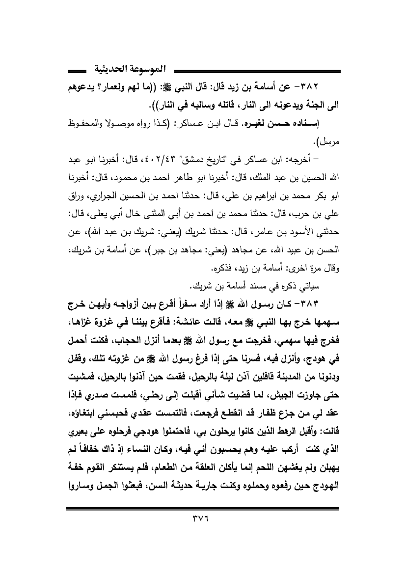 ٣٨٣ - كان رسول الله -صَلَّى اللهُ عَلَيْهِ وَسَلَّمَ- إذا أراد سفرًا أقرع بين أزواجه وأيهن خرج سهمها خرج بها النبي -صَلَّى اللهُ عَلَيْهِ وَسَلَّمَ- معه، قالت عائشة: فأقرع بيننا في غزوة غزاها، فخرج فيها سهمي، فخرجت مع رسول الله -صَلَّى اللهُ عَلَيْهِ وَسَلَّمَ- بعدما أنزل الحجاب، فكنت أحمل في هودج، وأنزل فيه، فسرنا حتى إذا فرغ رسول الله -صَلَّى اللهُ عَلَيْهِ وَسَلَّمَ- من غزوته تلك، وقفل ودنونا من المدينة قافلين آذن ليلة بالرحيل، فقمت حين آذنوا بالرحيل، فمشيت حتى جاوزت الجيش، لما قضيت شأني أقبلت إلى رحلي، فلمست صدري فإذا عقد لي من جزع ظفار قد انقطع فرجعت، فالتمست عقدي فحبسني ابتغاؤه، قالت: وأقبل الرهط الذين كانوا يرحلون بي، فاحتملوا هودجي فرحلوه على بعيري الذي كنت أركب عليه وهم يحسبون أني فيه، وكان النساء إذ ذاك خفافًا لم يهبلن ولم يغشهن اللحم إنما يأكلن العلقة من الطعام، فلم يستنكر القوم خفة الهودج حين رفعوه وحملوه وكنت جارية حديثة السن، فبعثوا الجمل وساروا