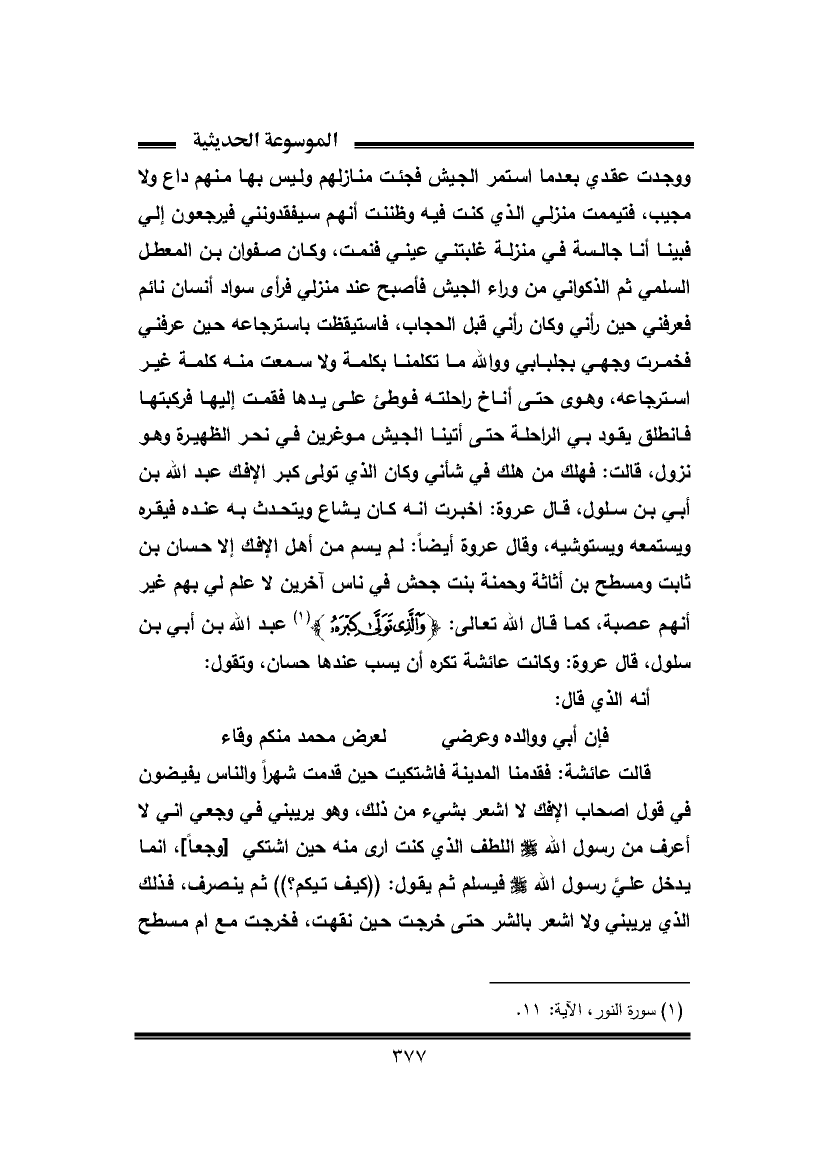 ووجدت عقدي بعدما استمر الجيش فجئت منازلهم وليس بها منهم داع ولا مجيب، فتيممت منزلي الذي كنت فيه وظننت أنهم سيفقدونني فيرجعون إلي فبينا أنا جالسة في منزلة غلبتني عيني فنمت، وكان صفوان بن المعطل السلمي ثم الذكواني من وراء الجيش فأصبح عند منزلي فرأى سواد إنسان نائم فعرفني حين رآني وكان رآني قبل الحجاب، فاستيقظت باسترجاعه حين عرفني فخمرت وجهي بجلبابي ووالله ما تكلمنا بكلمة ولا سمعت منه كلمة غير استرجاعه، وهوى حتى أناخ راحلته فوطئ على يدها فقمت إليها فركبتها فانطلق يقود بي الراحلة حتى أتينا الجيش موغرين في نحر الظهيرة وهو نزول، قالت: فهلك من هلك في شأني وكان الذي تولى كبر الإفك عبد الله بن أبي بن سلول، قال عروة: أخبرت أنه كان يشاع ويتحدث به عنده فيقره ويستمعه ويستوشيه، وقال عروة أيضًا: لم يسم من أهل الإفك إلا حسان بن ثابت ومسطح بن أثاثة وحمنة بنت جحش في ناس آخرين لا علم لي بهم غير أنهم عصبة، كما قال الله تعالى: {وَالَّذِي تَوَلَّى كِبْرَهُ} (¬١) عبد الله بن أبي بن سلول، قال عروة: وكانت عائشة تكره أن يسب عندها حسان، وتقول: