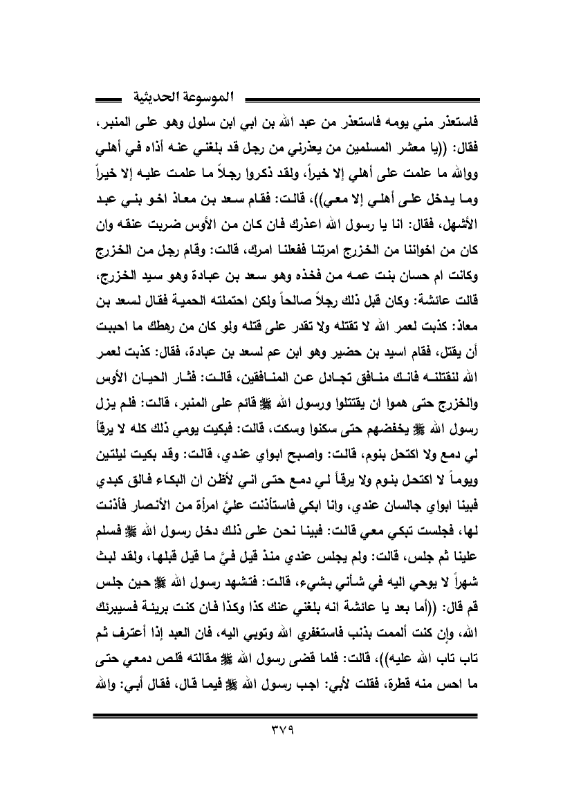 فاستعذر مني يومه فاستعذر من عبد الله بن أبي ابن سلول وهو على المنبر، فقال: ((يا معشر المسلمين من يعذرني من رجل قد بلغني عنه أذاه في أهلي ووالله ما علمت على أهلي إلا خيرًا، ولقد ذكروا رجلًا ما علمت عليه إلا خيرًا وما يدخل على أهلي إلا معي))، قالت: فقام سعد بن معاذ أخو بني عبد الأشهل، فقال: أنا يا رسول الله أعذرك فإن كان من الأوس ضربت عنقه وإن كان من إخواننا من الخزرج أمرتنا ففعلنا أمرك، قالت: وقام رجل من الخزرج وكانت أم حسان بنت عمه من فخذه وهو سعد بن عبادة وهو سيد الخزرج، قالت عائشة: وكان قبل ذلك رجلًا صالحًا ولكن احتملته الحمية فقال لسعد بن معاذ: كذبت لعمر الله لا تقتله ولا تقدر على قتله ولو كان من رهطك ما أحببت أن يقتل، فقام أسيد بن حضير وهو ابن عم لسعد بن عبادة، فقال: كذبت لعمر الله لنقتلنه فإنك منافق تجادل عن المنافقين، قالت: فثار الحيان الأوس والخزرج حتى هموا أن يقتتلوا ورسول الله -صَلَّى اللهُ عَلَيْهِ وَسَلَّمَ- قائم على المنبر، قالت: فلم يزل رسول الله -صَلَّى اللهُ عَلَيْهِ وَسَلَّمَ- يخفضهم حتى سكنوا وسكت، قالت: فبكيت يومي ذلك كله لا يرقأ لي دمع ولا أكتحل بنوم، قالت: وأصبح أبواي عندي، قالت: وقد بكيت ليلتين ويومًا لا أكتحل بنوم ولا يرقأ لي دمع حتى إني لأظن أن البكاء فالق كبدي فبينا أبواي جالسان عندي، وأنا أبكي فاستأذنت عليَّ امرأة من الأنصار فأذنت لها، فجلست تبكي معي قالت: فبينا نحن على ذلك دخل رسول الله -صَلَّى اللهُ عَلَيْهِ وَسَلَّمَ- فسلم علينا ثم جلس، قالت: ولم يجلس عندي منذ قيل فيَّ ما قيل قبلها، ولقد لبث شهرًا لا يوحي إليه في شأني بشيء، قالت: فتشهد رسول الله -صَلَّى اللهُ عَلَيْهِ وَسَلَّمَ- حين جلس ثم قال: ((أما بعد يا عائشة إنه بلغني عنك كذا وكذا فإن كنت بريئة فسيبرئك الله، وإن كنت ألممت بذنب فاستغفري الله وتوبي إليه، فإن العبد إذا اعترف ثم تاب تاب الله عليه))، قالت: فلما قضى رسول الله -صَلَّى اللهُ عَلَيْهِ وَسَلَّمَ- مقالته قلص دمعي حتى ما أحس منه قطرة، فقلت لأبي: أجب رسول الله -صَلَّى اللهُ عَلَيْهِ وَسَلَّمَ- فيما قال، فقال أبي: والله