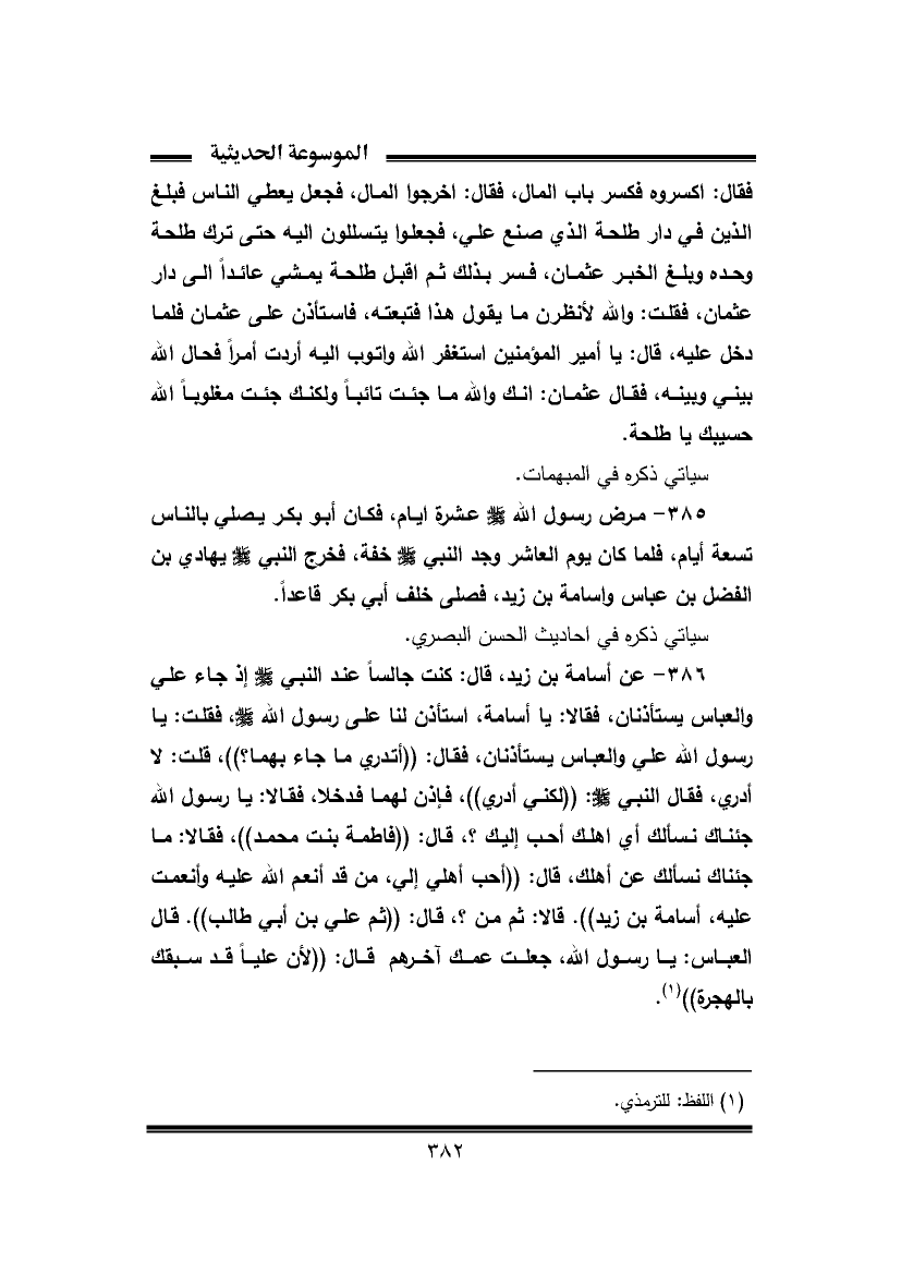 ٣٨٦ - عن أسامة بن زيد، قال: كنت جالسًا عند النبي -صَلَّى اللهُ عَلَيْهِ وَسَلَّمَ- إذ جاء علي والعباس يستأذنان، فقالا: يا أسامة، استأذن لنا على رسول الله -صَلَّى اللهُ عَلَيْهِ وَسَلَّمَ-، فقلت: يا رسول الله علي والعباس يستأذنان، فقال: ((أتدري ما جاء بهما؟))، قلت: لا أدري، فقال النبي -صَلَّى اللهُ عَلَيْهِ وَسَلَّمَ-: ((لكني أدري))، فأذن لهما فدخلا، فقالا: يا رسول الله جئناك نسألك أي أهلك أحب إليك؟، قال: ((فاطمة بنت محمد))، فقالا: ما جئناك نسألك عن أهلك، قال: ((أحب أهلي إلي، من قد أنعم الله عليه وأنعمت عليه، أسامة بن زيد)). قالا: ثم من؟، قال: ((ثم علي بن أبي طالب)). قال العباس: يا رسول الله، جعلت عمك آخرهم قال: ((لأن عليًّا قد سبقك بالهجرة)) (¬١).