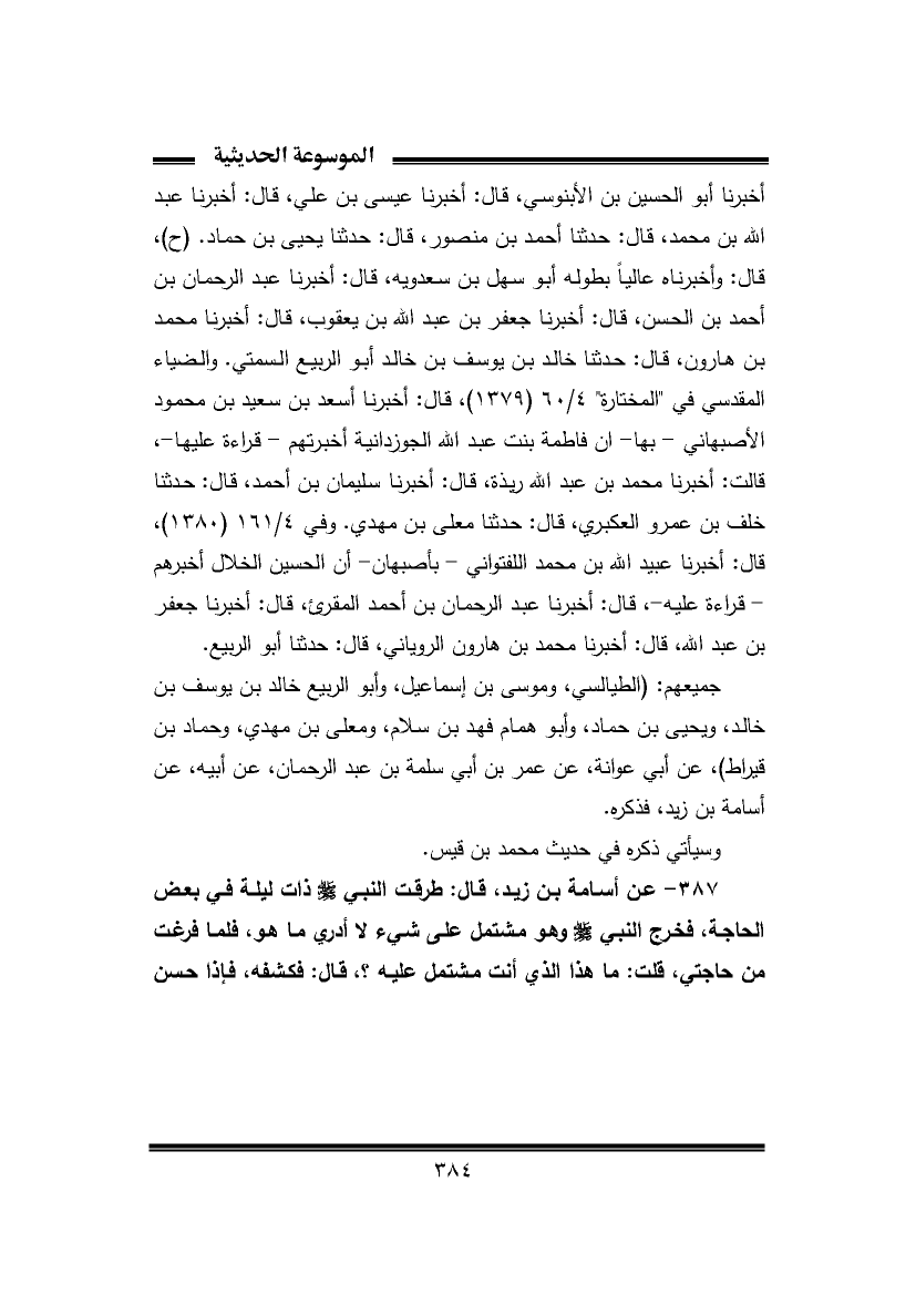 ٣٨٧ - عن أسامة بن زيد، قال: طرقت النبي -صَلَّى اللهُ عَلَيْهِ وَسَلَّمَ- ذات ليلة في بعض الحاجة، فخرج النبي -صَلَّى اللهُ عَلَيْهِ وَسَلَّمَ- وهو مشتمل على شيء لا أدري ما هو، فلما فرغت من حاجتي، قلت: ما هذا الذي أنت مشتمل عليه؟، قال: فكشفه، فإذا حسن