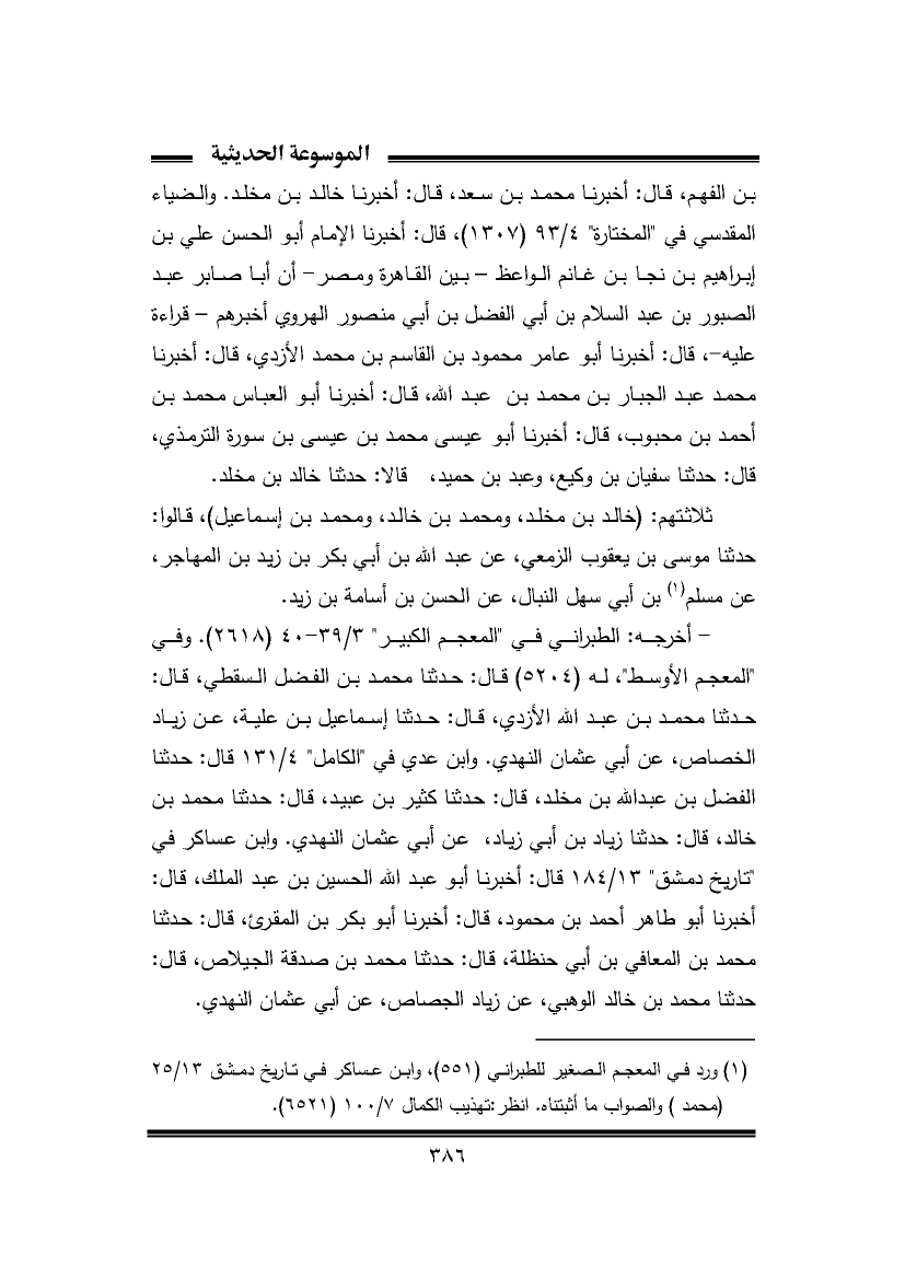 بن الفهم، قال: أخبرنا محمد بن سعد، قال: أخبرنا خالد بن مخلد. والضياء المقدسي في "المختارة" ٤/ ٩٣ (١٣٠٧)، قال: أخبرنا الإمام أبو الحسن علي بن إبراهيم بن نجا بن غانم الواعظ -بين القاهرة ومصر- أن أبا صابر عبد الصبور بن عبد السلام بن أبي الفضل بن أبي منصور الهروي أخبرهم -قراءة عليه-، قال: أخبرنا أبو عامر محمود بن القاسم بن محمد الأزدي، قال: أخبرنا محمد عبد الجبار بن محمد بن عبد الله، قال: أخبرنا أبو العباس محمد بن أحمد بن محبوب، قال: أخبرنا أبو عيسى محمد بن عيسى بن سورة الترمذي، قال: حدثنا سفيان بن وكيع، وعبد بن حميد، قالا: حدثنا خالد بن مخلد.