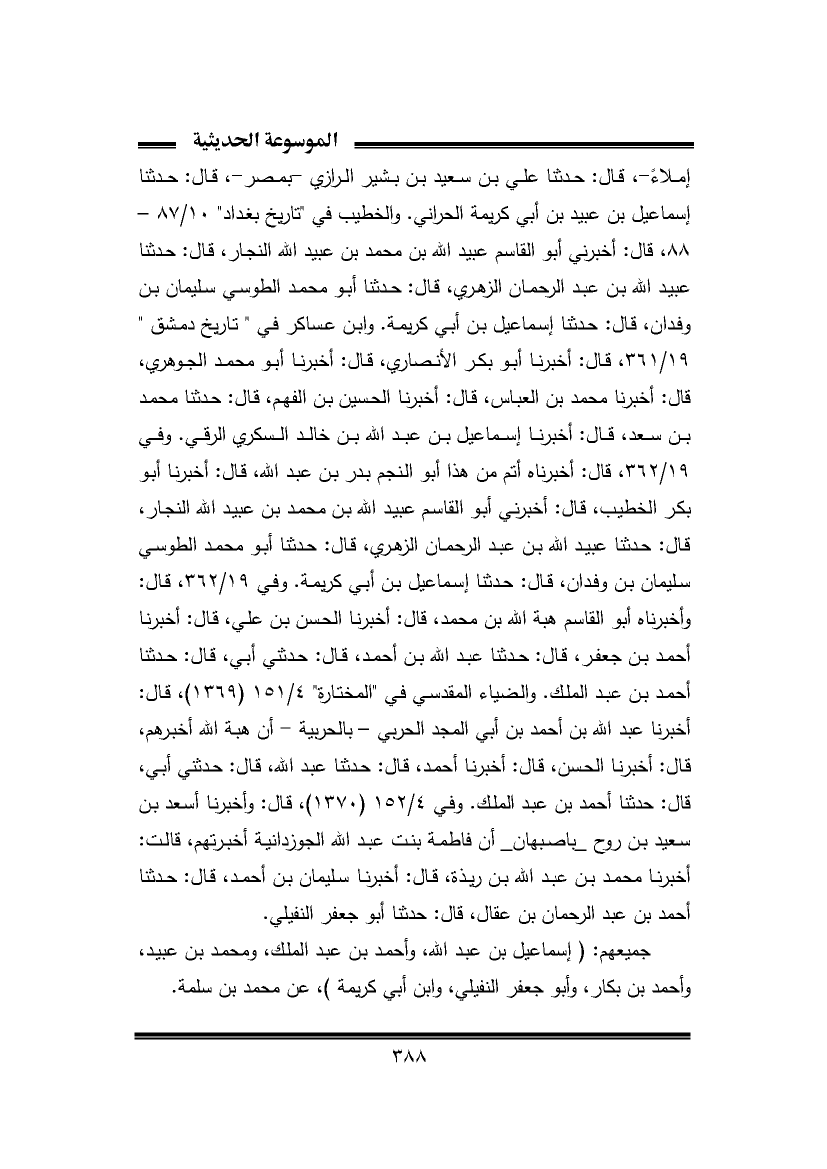 إملاءً-، قال: حدثنا علي بن سعيد بن بشير الرازي -بمصر-، قال: حدثنا إسماعيل بن عبيد بن أبي كريمة الحراني. والخطيب في "تاريخ بغداد"، ١٠/ ٨٧ - ٨٨، قال: أخبرني أبو القاسم عبيد الله بن محمد بن عبيد الله النجار، قال: حدثنا عبيد الله بن عبد الرحمان الزهري، قال: حدثنا أبو محمد الطوسي سليمان بن وفدان، قال: حدثنا إسماعيل بن أبي كريمة. وابن عساكر في "تاريخ دمشق" ١٩/ ٣٦١، قال: أخبرنا أبو بكر الأنصاري، قال: أخبرنا أبو محمد الجوهري، قال: أخبرنا محمد بن العباس، قال: أخبرنا الحسين بن الفهم، قال: حدثنا محمد بن سعد، قال: أخبرنا إسماعيل بن عبد الله بن خالد السكري الرقي. وفي ١٩/ ٣٦٢، قال: أخبرناه أتم من هذا أبو النجم بدر بن عبد الله، قال: أخبرنا أبو بكر الخطيب، قال: أخبرني أبو القاسم عبيد الله بن محمد بن عبيد الله النجار، قال: حدثنا عبيد الله بن عبد الرحمان الزهري، قال: حدثنا أبو محمد الطوسي سليمان بن وفدان، قال: حدثنا إسماعيل بن أبي كريمة. وفي ١٩/ ٣٦٢، قال: وأخبرناه أبو القاسم هبة الله بن محمد، قال: أخبرنا الحسن بن علي، قال: أخبرنا أحمد بن جعفر، قال: حدثنا عبد الله بن أحمد، قال: حدثني أبي، قال: حدثنا أحمد بن عبد الملك. والضياء المقدسي في "المختارة" ٤/ ١٥١ (١٣٦٩)، قال: أخبرنا عبد الله بن أحمد بن أبي المجد الحربي -بالحربية- أن هبة الله أخبرهم، قال: أخبرنا الحسن، قال: أخبرنا أحمد، قال: حدثنا عبد الله، قال: حدثني أبي، قال: حدثنا أحمد بن عبد الملك. وفي ٤/ ١٥٢ (١٣٧٠)، قال: وأخبرنا أسعد بن سعيد بن روح بأصبهان أن فاطمة بنت عبد الله الجوزدانية أخبرتهم، قالت: أخبرنا محمد بن عبد الله بن ريذة، قال: أخبرنا سليمان بن أحمد، قال: حدثنا أحمد بن عبد الرحمان بن عقال، قال: حدثنا أبو جعفر النفيلي.