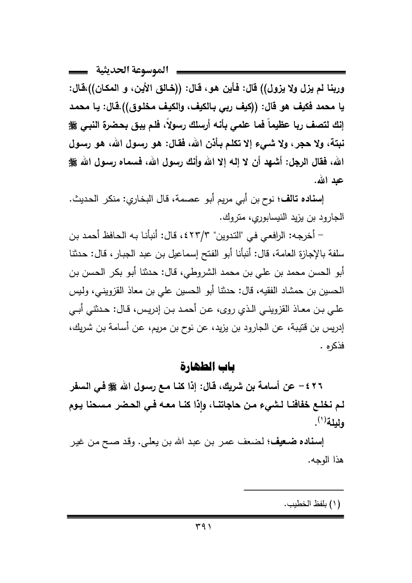 - أخرجه: الرافعي في "التدوين" ٣/ ٤٢٣، قال: أنبأنا به الحافظ أحمد بن سلفة بالإجازة العامة، قال: أنبأنا أبو الفتح إسماعيل بن عبد الجبار، قال: حدثنا أبو الحسن محمد بن علي بن محمد الشروطي، قال: حدثنا أبو بكر الحسن بن الحسين بن حمشاد الفقيه، قال: حدثنا أبو الحسين علي بن معاذ القزويني، وليس علي بن معاذ القزويني الذي روى، عن أحمد بن إدريس، قال: حدثني أبي إدريس بن قتيبة، عن الجارود بن يزيد، عن نوح بن مريم، عن أسامة بن شريك، فذكره.