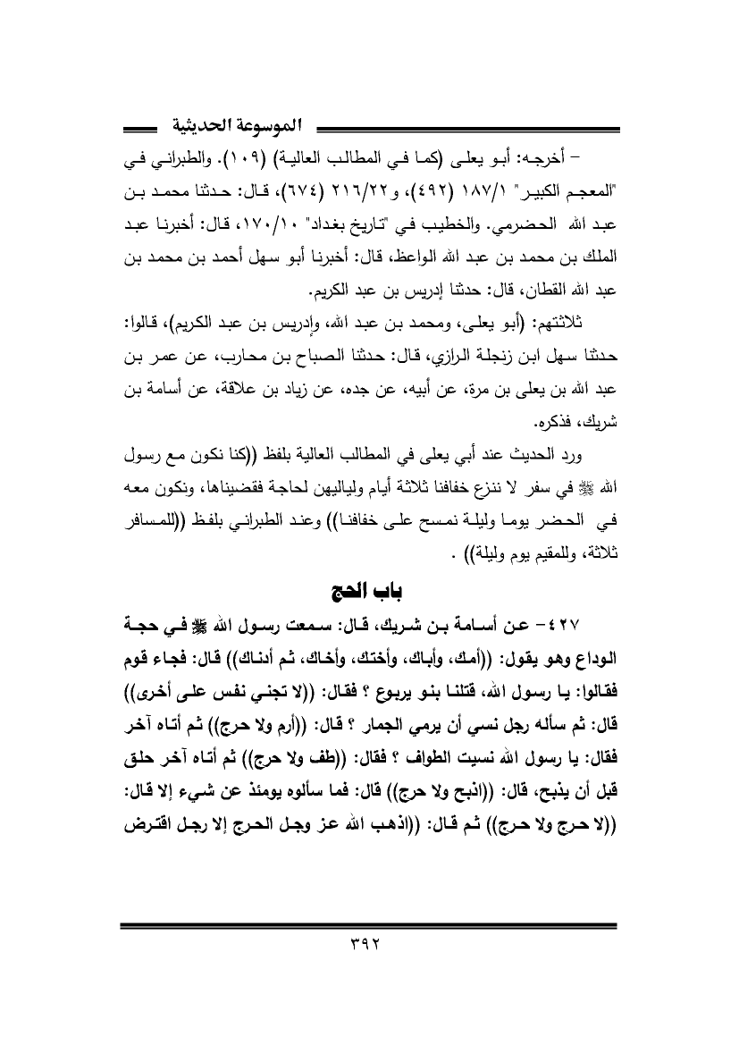 ثلاثتهم: (أبو يعلى، ومحمد بن عبد الله، وإدريس بن عبد الكريم)، قالوا: حدثنا سهل ابن زنجلة الرازي، قال: حدثنا الصباح بن محارب، عن عمر بن عبد الله بن يعلى بن مرة، عن أبيه، عن جده، عن زياد بن علاقة، عن أسامة بن شريك، فذكره.