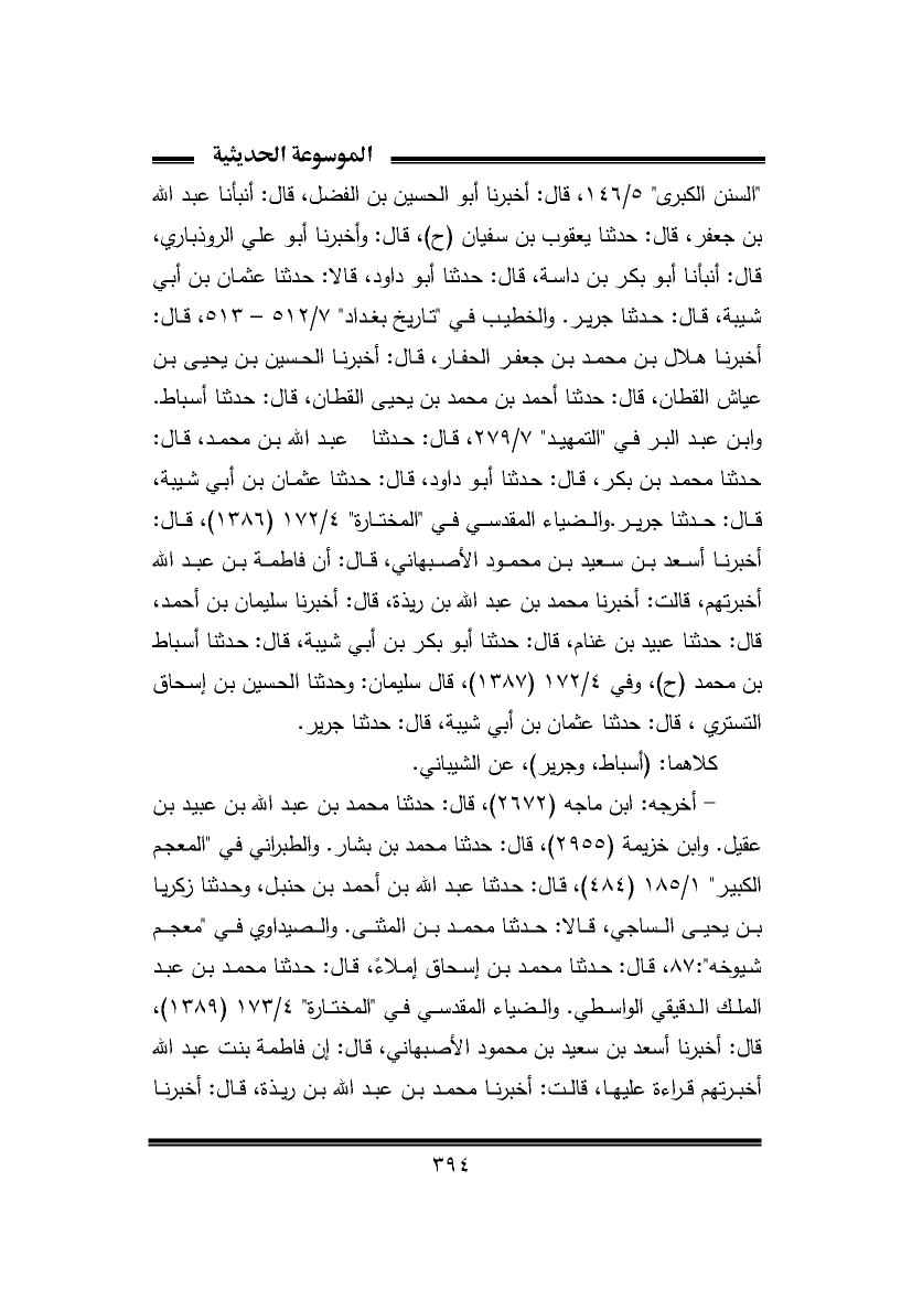 "السنن الكبرى" ٥/ ١٤٦، قال: أخبرنا أبو الحسين بن الفضل، قال: أنبأنا عبد الله بن جعفر، قال: حدثنا يعقوب بن سفيان (ح)، قال: وأخبرنا أبو علي الروذباري، قال: أنبأنا أبو بكر بن داسة، قال: حدثنا أبو داود، قالا: حدثنا عثمان بن أبي شيبة، قال: حدثنا جرير. والخطيب في "تاريخ بغداد" ٧/ ٥١٢ - ٥١٣، قال: أخبرنا هلال بن محمد بن جعفر الحفار، قال: أخبرنا الحسين بن يحيى بن عياش القطان، قال: حدثنا أحمد بن محمد بن يحيى القطان، قال: حدثنا أسباط. وابن عبد البر في "التمهيد" ٧/ ٢٧٩، قال: حدثنا عبد الله بن محمد، قال: حدثنا محمد بن بكر، قال: حدثنا أبو داود، قال: حدثنا عثمان بن أبي شيبة، قال: حدثنا جرير. والضياء المقدسي في "المختارة" ٤/ ١٧٢ (١٣٨٦)، قال: أخبرنا أسعد بن سعيد بن محمود الأصبهاني، قال: أن فاطمة بنت عبد الله أخبرتهم، قالت: أخبرنا محمد بن عبد الله بن ريذة، قال: أخبرنا سليمان بن أحمد، قال: حدثنا عبيد بن غنام، قال: حدثنا أبو بكر بن أبي شيبة، قال: حدثنا أسباط بن محمد (ح)، وفي ٤/ ١٧٢ (١٣٨٧)، قال سليمان: وحدثنا الحسين بن إسحاق التستري، قال: حدثنا عثمان بن أبي شيبة، قال: حدثنا جرير.