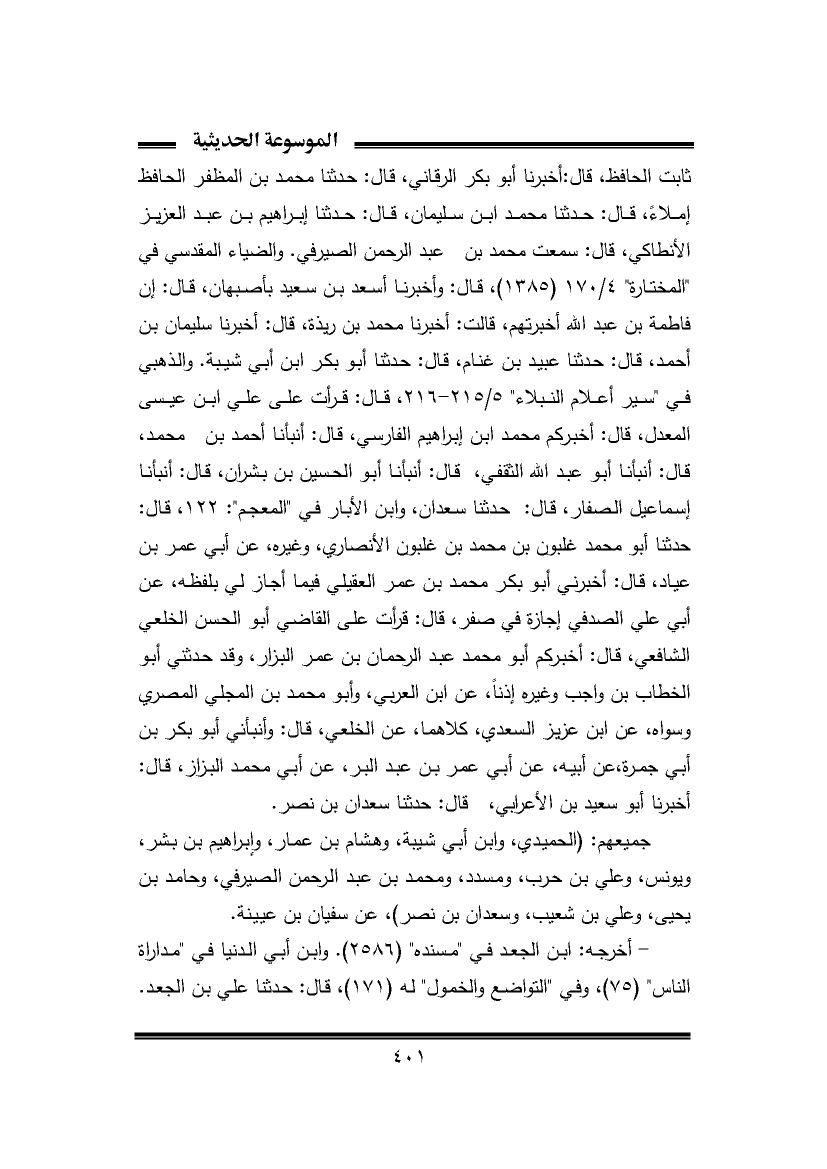 ثابت الحافظ، قال: أخبرنا أبو بكر الرقاني، قال: حدثنا محمد بن المظفر الحافظ إملاءً، قال: حدثنا محمد ابن سليمان، قال: حدثنا إبراهيم بن عبد العزيز الأنطاكي، قال: سمعت محمد بن عبد الرحمن الصيرفي. والضياء المقدسي في "المختارة" ٤/ ١٧٠ (١٣٨٥)، قال: وأخبرنا أسعد بن سعيد بأصبهان، قال: إن فاطمة بنت عبد الله أخبرتهم، قالت: أخبرنا محمد بن ريذة، قال: أخبرنا سليمان بن أحمد، قال: حدثنا عبيد بن غنام، قال: حدثنا أبو بكر ابن أبي شيبة. والذهبي في "سير أعلام النبلاء" ٥/ ٢١٥ - ٢١٦، قال: قرأت على علي ابن عيسى المعدل، قال: أخبركم محمد ابن إبراهيم الفارسي، قال: أنبأنا أحمد بن محمد، قال: أنبأنا أبو عبد الله الثقفي، قال: أنبأنا أبو الحسين بن بشران، قال: أنبأنا إسماعيل الصفار، قال: حدثنا سعدان، وابن الأبار في "المعجم": ١٢٢، قال: حدثنا أبو محمد غلبون بن محمد بن غلبون الأنصاري، وغيره، عن أبي عمر بن عياد، قال: أخبرني أبو بكر محمد بن عمر العقيلي فيما أجاز لي بلفظه، عن أبي علي الصدفي إجازة في صفر، قال: قرأت على القاضي أبو الحسن الخلعي الشافعي، قال: أخبركم أبو محمد عبد الرحمان بن عمر البزار، وقد حدثني أبو الخطاب بن واجب وغيره إذنًا، عن ابن العربي، وأبو محمد بن المجلي المصري وسواه، عن ابن عزيز السعدي، كلاهما، عن الخلعي، قال: وأنبأني أبو بكر بن أبي جمرة، عن أبيه، عن أبي عمر بن عبد البر، عن أبي محمد البزاز، قال: أخبرنا أبو سعيد بن الأعرابي، قال: حدثنا سعدان بن نصر.