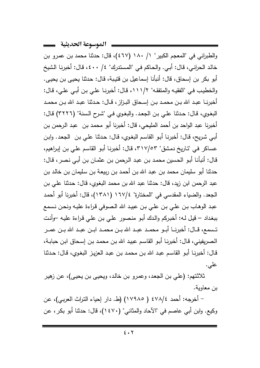 والطبراني في "المعجم الكبير" ١/ ١٨٠ (٤٦٧)، قال: حدثنا محمد بن عمرو بن خالد الحراني، قال: أبي. والحاكم في "المستدرك" ٤/ ٤٠٠، قال: أخبرنا الشيخ أبو بكر بن إسحاق، قال: أنبأنا إسماعيل بن قتيبة، قال: حدثنا يحيى بن يحيى. والخطيب في "الفقيه والمتفقه" ٢/ ١١١، قال: أخبرنا علي بن أبي علي، قال: أخبرنا عبد الله بن محمد بن إسحاق البزاز، قال: حدثنا عبد الله بن محمد البغوي، قال: حدثنا علي بن الجعد. والبغوي في "شرح السنة" (٣٢٢٦) قال: أخبرنا عبد الواحد بن أحمد المليحي، قال: أخبرنا أبو محمد بن عبد الرحمن بن أبي شريح، قال: أخبرنا أبو القاسم البغوي، قال: حدثنا علي بن الجعد. وابن عساكر في "تاريخ دمشق" ٥٣/ ٣١٧، قال: أخبرنا أبو القاسم علي بن إبراهيم، قال: أنبأنا أبو الحسين محمد بن عبد الرحمن بن عثمان بن أبي نصر، قال: حدثنا أبو سليمان محمد بن عبد الله بن أحمد بن ربيعة بن سليمان بن خالد بن عبد الرحمن ابن زيد، قال: حدثنا عبد الله بن محمد البغوي، قال: حدثنا علي بن الجعد. والضياء المقدسي في "المختارة" ٤/ ١٦٧ (١٣٨١)، قال: أخبرنا أبو أحمد عبد الوهاب بن علي بن علي بن عبيد الله الصوفي قراءة عليه ونحن نسمع ببغداد -قيل له: أخبركم والدك أبو منصور علي بن علي قراءة عليه- وأنت تسمع، قال: أخبرنا أبو محمد عبد الله بن محمد ابن عبد الله بن عمر الصريفيني، قال: أخبرنا أبو القاسم عبيد الله بن محمد بن إسحاق ابن حبابة، قال: أخبرنا أبو القاسم عبد الله بن محمد بن عبد العزيز البغوي، قال: حدثنا علي.