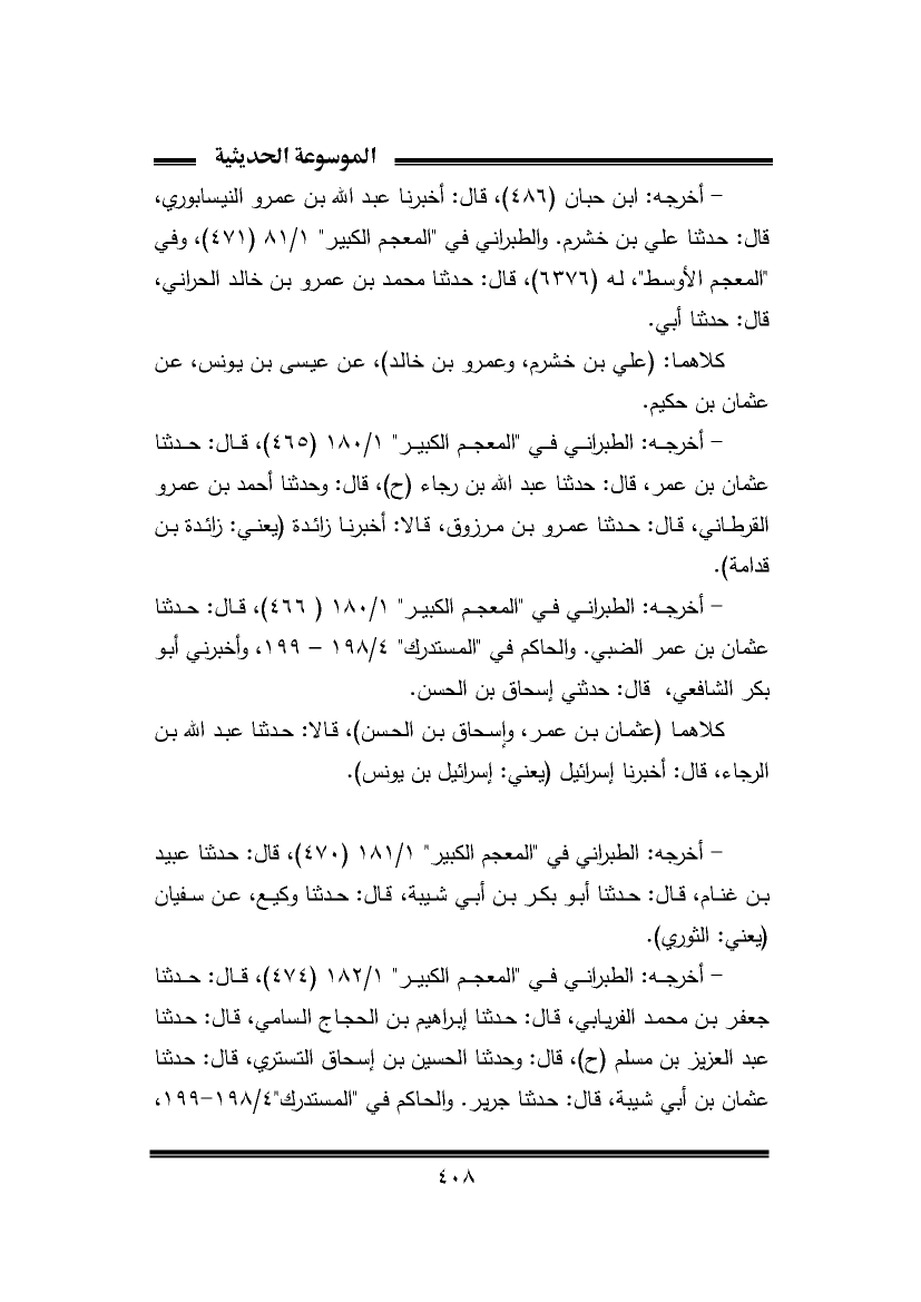 - أخرجه: الطبراني في "المعجم الكبير" ١/ ١٨٠ (٤٦٦)، قال: حدثنا عثمان بن عمر الضبي. والحاكم في "المستدرك" ٤/ ١٩٨ - ١٩٩، وأخبرني أبو بكر الشافعي، قال: حدثني إسحاق بن الحسن.