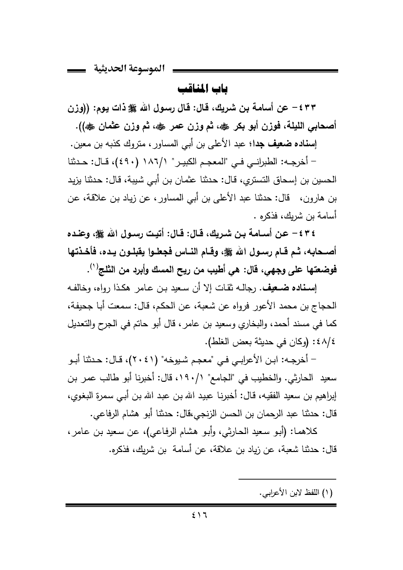 ٤٣٣ - عن أسامة بن شريك، قال: قال رسول الله -صَلَّى اللهُ عَلَيْهِ وَسَلَّمَ- ذات يوم: ((وزن أصحابي الليلة، فوزن أبو بكر -رَضِيَ اللهُ عَنْهُ-، ثم وزن عمر -رَضِيَ اللهُ عَنْهُ-، ثم وزن عثمان -رَضِيَ اللهُ عَنْهُ-)).