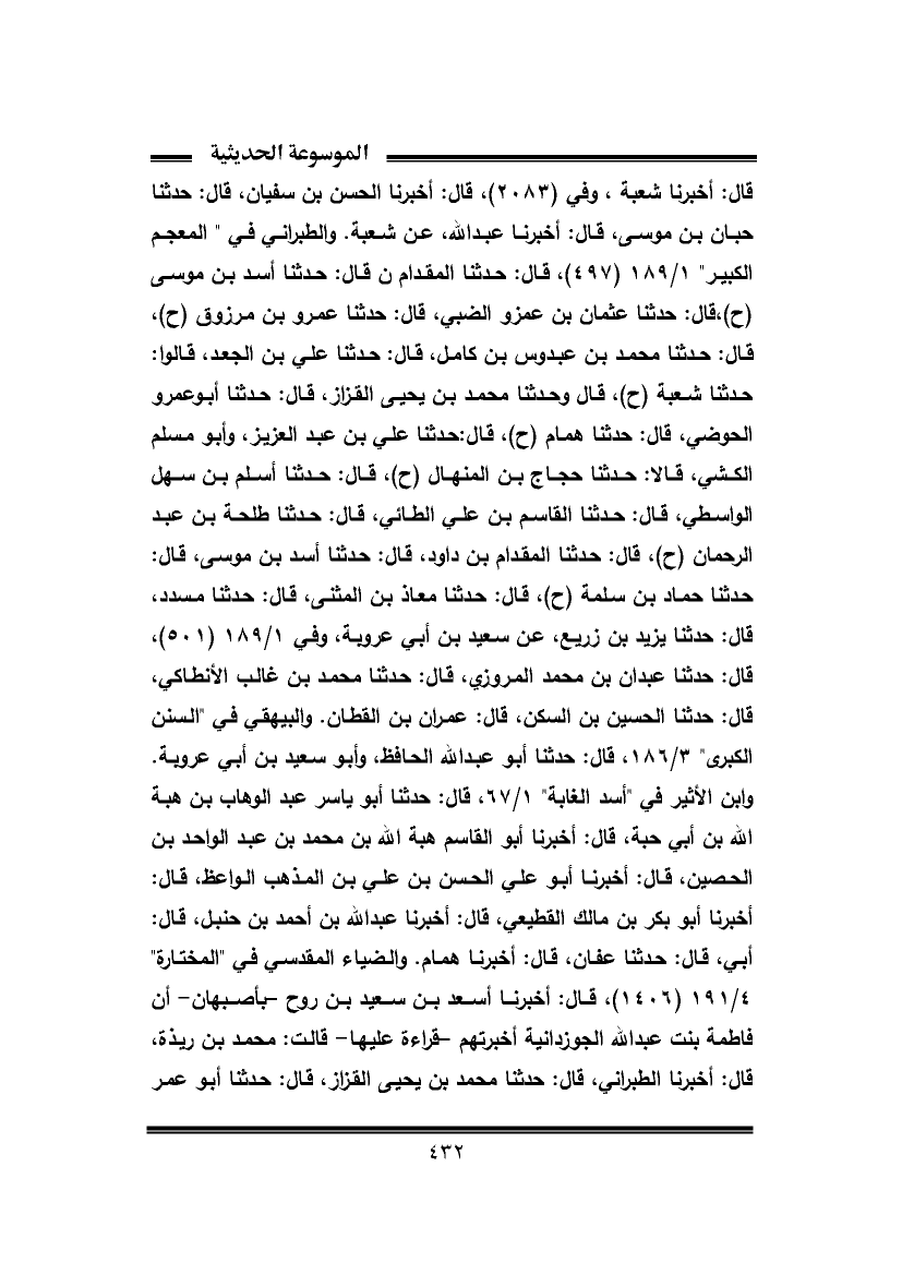 قال: أخبرنا شعبة، وفي (٢٠٨٣)، قال: أخبرنا الحسن بن سفيان، قال: حدثنا حبان بن موسى، قال: أخبرنا عبد الله، عن شعبة. والطبراني في "المعجم الكبير" ١/ ١٨٩ (٤٩٧)، قال: حدثنا المقدام ن قال: حدثنا أسد بن موسى (ح)، قال: حدثنا عثمان بن عمرو الضبي، قال: حدثنا عمرو بن مرزوق (ح)، قال: حدثنا محمد بن عبدوس بن كامل، قال: حدثنا علي بن الجعد، قالوا: حدثنا شعبة (ح)، قال وحدثنا محمد بن يحيى القزاز، قال: حدثنا أبو عمرو الحوضي، قال: حدثنا همام (ح)، قال: حدثنا علي بن عبد العزيز، وأبو مسلم الكشي، قالا: حدثنا حجاج بن المنهال (ح)، قال: حدثنا أسلم بن سهل الواسطي، قال: حدثنا القاسم بن علي الطائي، قال: حدثنا طلحة بن عبد الرحمان (ح)، قال: حدثنا المقدام بن داود، قال: حدثنا أسد بن موسى، قال: حدثنا حماد بن سلمة (ح)، قال: حدثنا معاذ بن المثنى، قال: حدثنا مسدد، قال: حدثنا يزيد بن زريع، عن سعيد بن أبي عروبة، وفي ١/ ١٨٩ (٥٠١)، قال: حدثنا عبدان بن محمد المروزي، قال: حدثنا محمد بن غالب الأنطاكي، قال: حدثنا الحسين بن السكن، قال: عمران بن القطان. والبيهقي في "السنن الكبرى" ٣/ ١٨٦، قال: حدثنا أبو عبد الله الحافظ، وأبو سعيد بن أبي عروبة. وابن الأثير في "أسد الغابة" ١/ ٦٧، قال: حدثنا أبو ياسر عبد الوهاب بن هبة الله بن أبي حبة، قال: أخبرنا أبو القاسم هبة الله بن محمد بن عبد الواحد بن الحصين، قال: أخبرنا أبو علي الحسن بن علي بن المذهب الواعظ، قال: أخبرنا أبو بكر بن مالك القطيعي، قال: أخبرنا عبد الله بن أحمد بن حنبل، قال: أبي، قال: حدثنا عفان، قال: أخبرنا همام. والضياء المقدسي في "المختارة" ٤/ ١٩١ (١٤٠٦)، قال: أخبرنا أسعد بن سعيد بن روح -بأصبهان- أن فاطمة بنت عبد الله الجوزدانية أخبرتهم -قراءة عليها - قالت: محمد بن ريذة، قال: أخبرنا الطَّبراني، قال: حدثنا محمد بن يحيى القزاز، قال: حدثنا أبو عمر