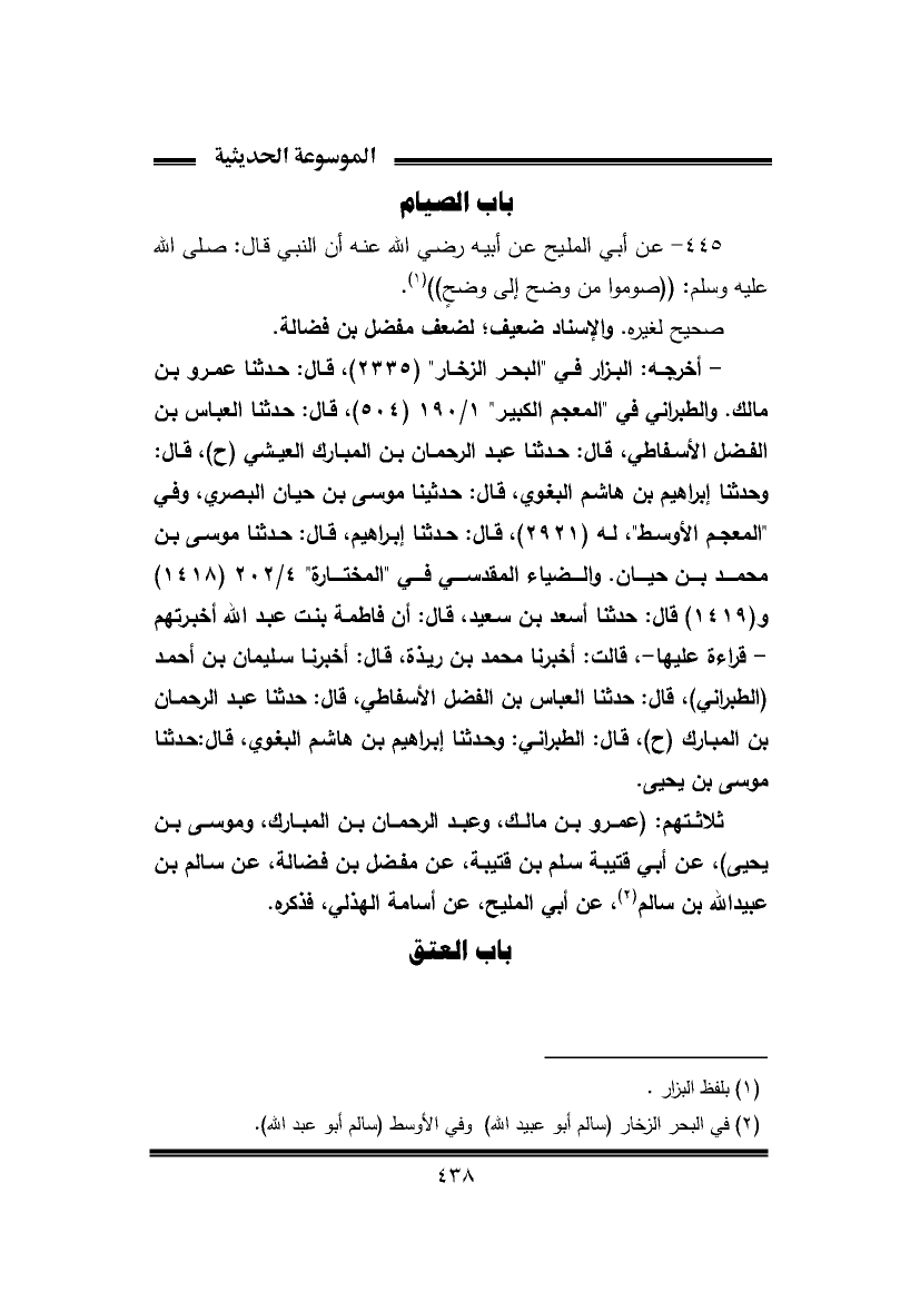 ٤٤٥ - عن أبي المليح عن أبيه رضي الله عنه أن النَّبِيّ قال: صلى الله عليه وسلم: ((صوموا من وضح إلى وضحٍ)) (¬١).