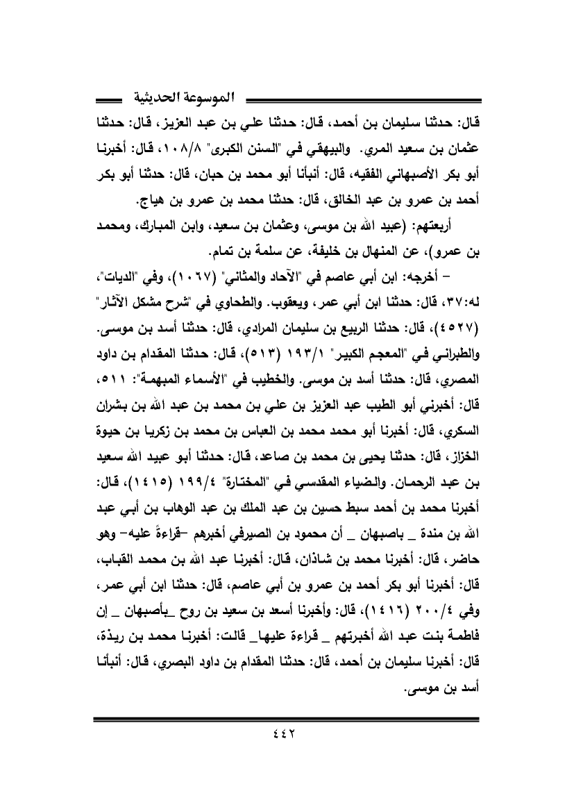 - أخرجه: ابن أبي عاصم في "الآحاد والمثاني" (١٠٦٧)، وفي "الديات"، له: ٣٧، قال: حدثنا ابن أبي عمر، ويعقوب. والطحاوي في "شرح مشكل الآثار" (٤٥٢٧)، قال: حدثنا الربيع بن سليمان المرادي، قال: حدثنا أسد بن موسى. والطبراني في "المعجم الكبير" ١/ ١٩٣ (٥١٣)، قال: حدثنا المقدام بن داود المصري، قال: حدثنا أسد بن موسى. والخطيب في "الأسماء المبهمة": ٥١١، قال: أخبرني أبو الطيب عبد العزيز بن علي بن محمد بن عبد الله بن بشران السكري، قال: أخبرنا أبو محمد محمد بن العباس بن محمد بن زكريا بن حيوة الخزاز، قال: حدثنا يحيى بن محمد بن صاعد، قال: حدثنا أبو عبيد الله سعيد بن عبد الرحمان. والضياء المقدسي في "المختارة" ٤/ ١٩٩ (١٤١٥)، قال: أخبرنا محمد بن أحمد سبط حسين بن عبد الملك بن عبد الوهاب بن أبي عبد الله بن مندة -بأصبهان- أن محمود بن الصيرفي أخبرهم -قراءةً عليه- وهو حاضر، قال: أخبرنا محمد بن شاذان، قال: أخبرنا عبد الله بن محمد القباب، قال: أخبرنا أبو بكر أحمد بن عمرو بن أبي عاصم، قال: حدثنا ابن أبي عمر، وفي ٤/ ٢٠٠ (١٤١٦)، قال: وأخبرنا أسعد بن سعيد بن روح -بأصبهان- إن فاطمة بنت عبد الله أخبرتهم -قراءة عليها- قالت: أخبرنا محمد بن ريذة، قال: أخبرنا سليمان بن أحمد، قال: حدثنا المقدام بن داود البصري، قال: أنبأنا أسد بن موسى.