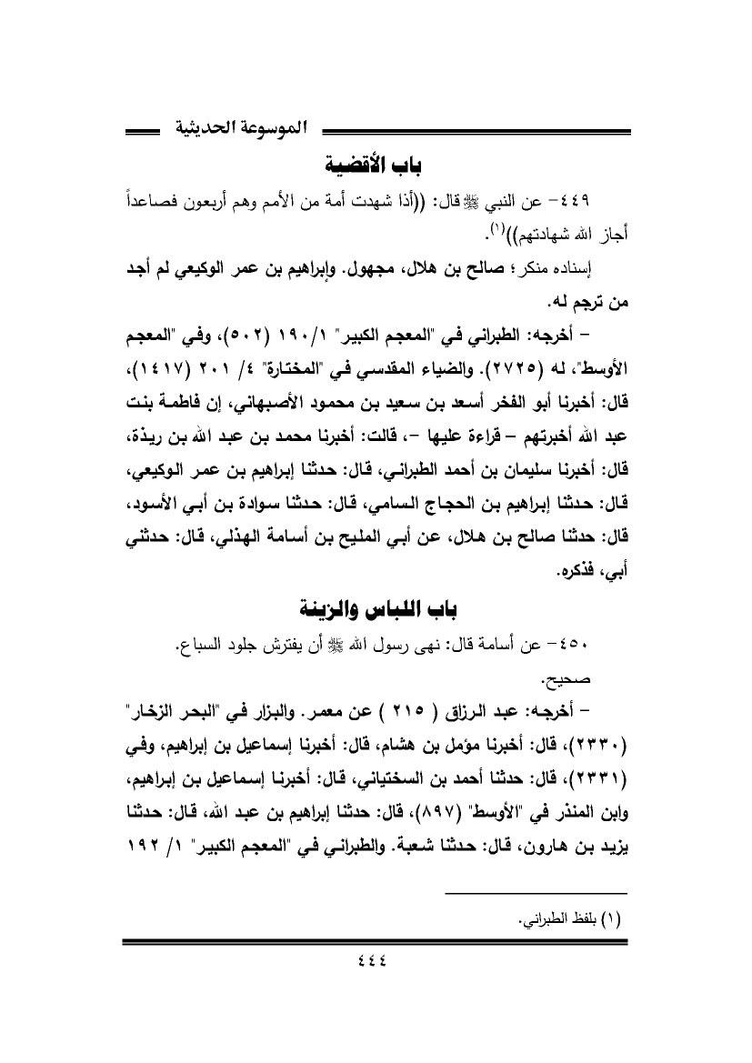 ٤٤٩ - عن النَّبِيّ -صَلَّى اللهُ عَلَيْهِ وَسَلَّمَ- قال: ((إذا شهدت أمة من الأمم وهم أربعون فصاعدًا أجاز الله شهادتهم)) (¬١).