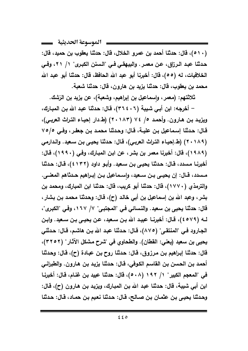 - أخرجه: ابن أبي شيبة (٣٦٤٠٦)، قال: حدثنا عبد الله بن المبارك، ويزيد بن هارون. وأحمد ٥/ ٧٤ (٢٠١٨٣) (ط. دار إحياء التراث العربي)، قال: حدثنا إسماعيل بن علية، قال: وحدثنا محمد بن جعفر، وفي ٥/ ٧٥ (٢٠١٨٩) (ط. إحياء التراث العربي)، قال: حدثنا يحيى بن سعيد. والدارمي (١٩٨٩)، قال: أخبرنا معمر بن بشر، عن ابن المبارك، وفي (١٩٩٠)، قال: أخبرنا مسدد، قال: حدثنا يحيى بن سعيد. وأبو داود (٤١٣٢)، قال: حدثنا مسدد، قال: إن يحيى بن سعيد، وإسماعيل بن إبراهيم حدثاهم المعنى. والترمذي (١٧٧٠)، قال: حدثنا أبو غريب، قال: حدثنا ابن المبارك، ومحمد بن بشر، وعبد الله بن إسماعيل بن أبي خالد (ح)، قال: وحدثنا محمد بن بشار، قال: حدثنا يحيى بن سعيد. والنسائي في "المجتبى" ٧/ ١٦٧، وفي "الكبرى"، له (٤٥٧٩)، قال: أخبرنا عبيد الله بن سعيد، عن يحيى بن سعيد. وابن الجارود في "المنتقى" (٨٧٥)، قال: حدثنا عبد الله بن هاشم، قال: حدثني يحيى بن سعيد (يعني: القطان). والطحاوي في "شرح مشكل الآثار" (٣٢٥٢)، قال: حدثنا إبراهيم بن مرزوق، قال: حدثنا روح بن عبادة (ح)، قال: وحدثنا أحمد بن الحسن بن القاسم الكوفي، قال: حدثنا يزيد بن هارون. والطبراني في "المعجم الكبير" ١/ ١٩٢ (٥٠٨)، قال: حدثنا عبيد بن غنام، قال: أخبرنا ابن أبي شيبة، قال: حدثنا عبد الله بن المبارك، ويزيد بن هارون (ح)، قال: وحدثنا يحيى بن عثمان بن صالح، قال: حدثنا نعيم بن حماد، قال: حدثنا