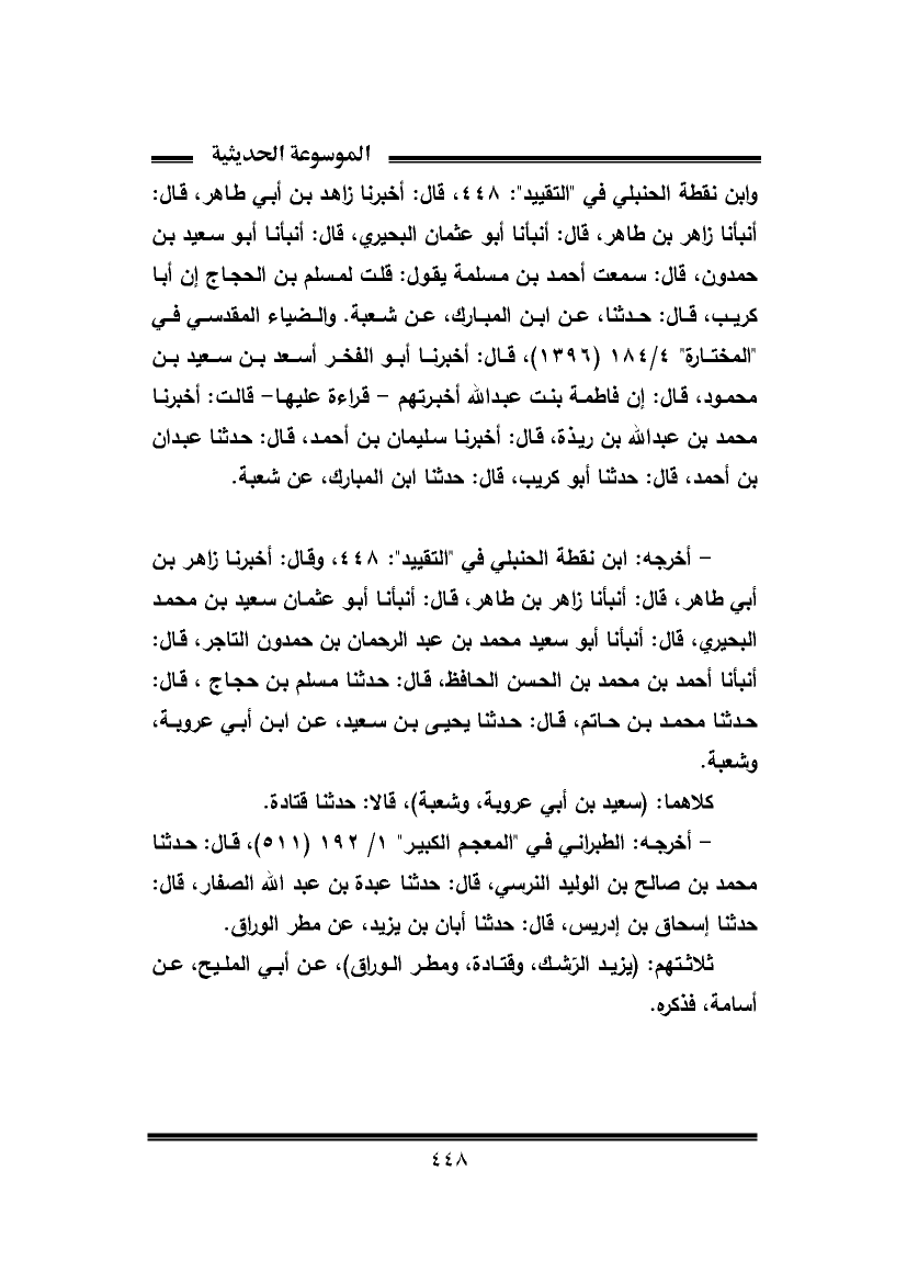 - أخرجه: ابن نقطة الحنبلي في "التقييد": ٤٤٨، وقال: أخبرنا زاهر بن أبي طاهر، قال: أنبأنا زاهر بن طاهر، قال: أنبأنا أبو عثمان سعيد بن محمد البحيري، قال: أنبأنا أبو سعيد محمد بن عبد الرحمان بن حمدون التاجر، قال: أنبأنا أحمد بن محمد بن الحسن الحافظ، قال: حدثنا مسلم بن حجاج، قال: حدثنا محمد بن حاتم، قال: حدثنا يحيى بن سعيد، عن ابن أبي عروبة، وشعبة.
