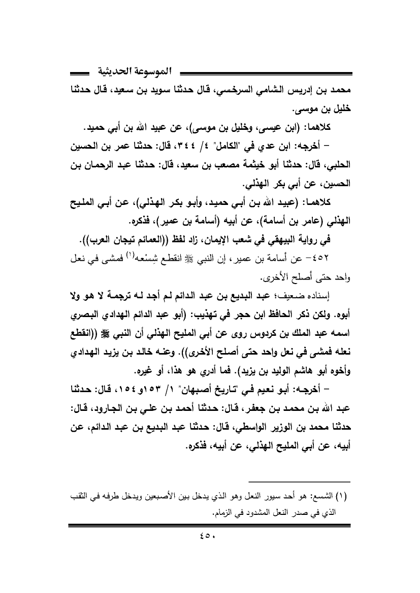 ٤٥٢ - عن أسامة بن عمير، إن النَّبِيّ -صَلَّى اللهُ عَلَيْهِ وَسَلَّمَ- انقطع شِسْعه (¬١) فمشى في نعل واحد حتى أصلح الأخرى.