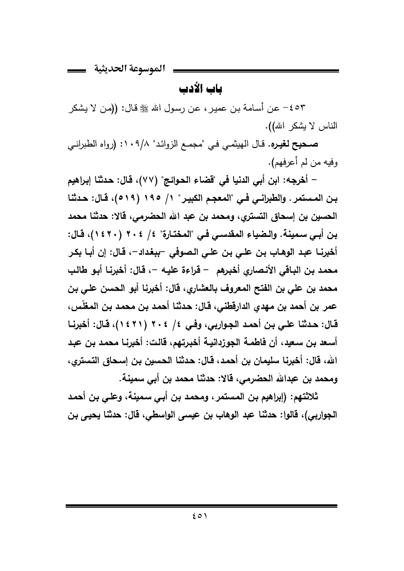 ٤٥٣ - عن أسامة بن عمير، عن رسول الله -صَلَّى اللهُ عَلَيْهِ وَسَلَّمَ- قال: ((من لا يشكر الناس لا يشكر الله)).