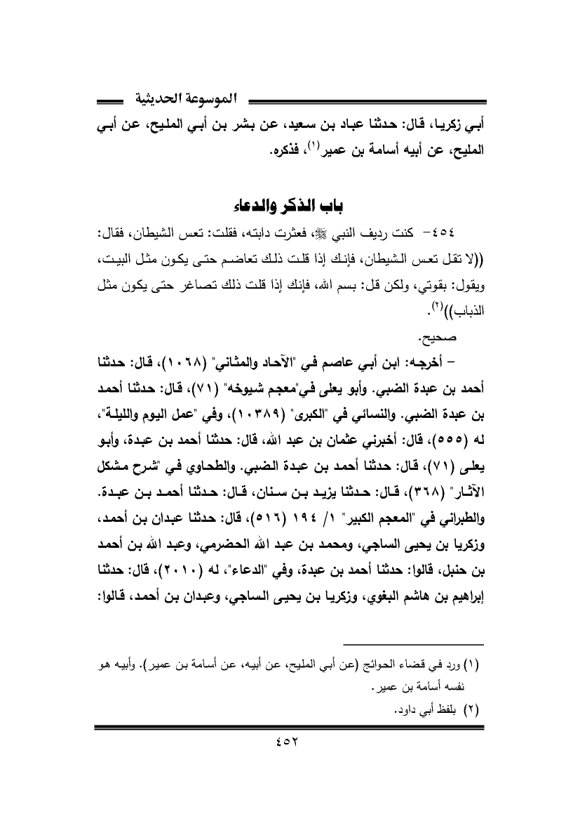 ٤٥٤ - كنت رديف النَّبِيّ -صَلَّى اللهُ عَلَيْهِ وَسَلَّمَ-، فعثرت دابته، فقلت: تعس الشيطان، فقال: ((لا تقل تعس الشيطان، فإنك إذا قلت ذلك تعاضم حتى يكون مثل البيت، ويقول: بقوتي، ولكن قل: بسم الله، فإنك إذا قلت ذلك تصاغر حتى يكون مثل الذباب)) (¬٢).