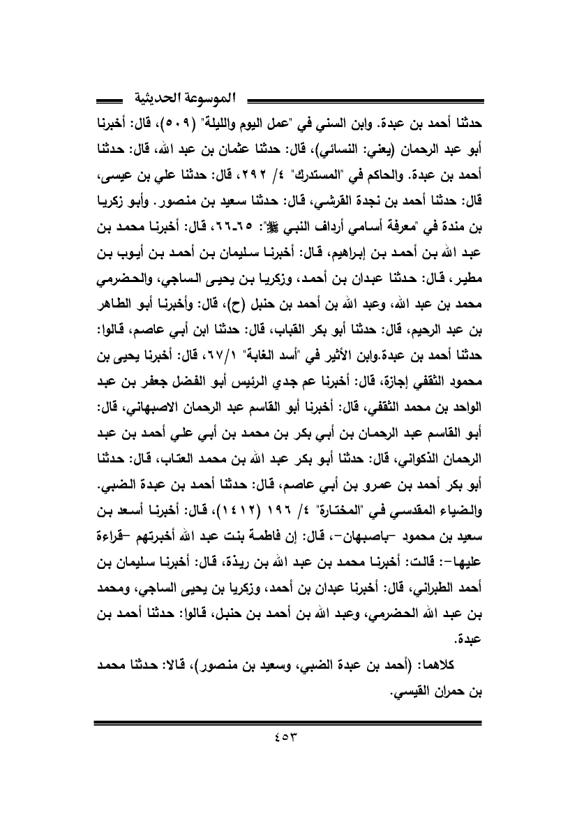 حدثنا أحمد بن عبدة. وابن السني في "عمل اليوم والليلة" (٥٠٩)، قال: أخبرنا أبو عبد الرحمان (يعني: النسائي)، قال: حدثنا عثمان بن عبد الله، قال: حدثنا أحمد بن عبدة. والحاكم في "المستدرك" ٤/ ٢٩٢، قال: حدثنا علي بن عيسى، قال: حدثنا أحمد بن نجدة القرشي، قال: حدثنا سعيد بن منصور. وأبو زكريا بن مندة في "معرفة أسامي أرداف النَّبِيّ -صَلَّى اللهُ عَلَيْهِ وَسَلَّمَ-: ٦٥ - ٦٦، قال: أخبرنا محمد بن عبد الله بن أحمد بن إبراهيم، قال: أخبرنا سليمان بن أحمد بن أيوب بن مطير، قال: حدثنا عبدان بن أحمد، وزكريا بن يحيى الساجي، والحضرمي محمد بن عبد الله، وعبد الله بن أحمد بن حنبل (ح)، قال: وأخبرنا أبو الطاهر بن عبد الرحيم، قال: حدثنا أبو بكر القباب، قال: حدثنا ابن أبي عاصم، قالوا: حدثنا أحمد بن عبدة. وابن الأثير في "أسد الغابة" ١/ ٦٧، قال: أخبرنا يحيى بن محمود الثقفي إجازة، قال: أخبرنا عم جدي الرئيس أبو الفضل جعفر بن عبد الواحد بن محمد الثقفي، قال: أخبرنا أبو القاسم عبد الرحمان الأصبهاني، قال: أبو القاسم عبد الرحمان بن أبي بكر بن محمد بن أبي علي أحمد بن عبد الرحمان الذكواني، قال: حدثنا أبو بكر عبد الله بن محمد العتاب، قال: حدثنا أبو بكر أحمد بن عمرو بن أبي عاصم، قال: حدثنا أحمد بن عبدة الضبي. والضياء المقدسي في "المختارة" ٤/ ١٩٦ (١٤١٢)، قال: أخبرنا أسعد بن سعيد بن محمود -بأصبهان-، قال: إن فاطمة بنت عبد الله أخبرتهم -قراءة عليها-: قالت: أخبرنا محمد بن عبد الله بن ريذة، قال: أخبرنا سليمان بن أحمد الطَّبراني، قال: أخبرنا عبدان بن أحمد، وزكريا بن يحيى الساجي، ومحمد بن عبد الله الحضرمي، وعبد الله بن أحمد بن حنبل، قالوا: حدثنا أحمد بن عبدة.