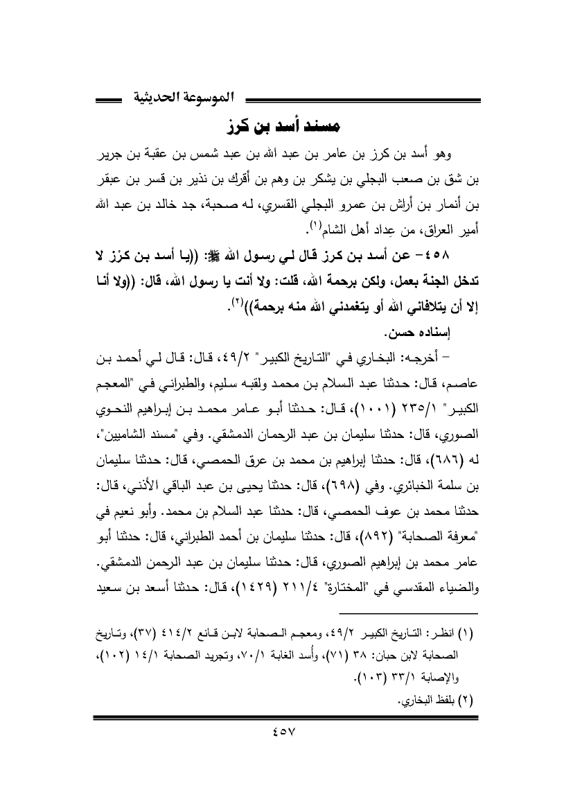 ٤٥٨ - عن أسد بن كرز قال لي رسول الله -صَلَّى اللهُ عَلَيْهِ وَسَلَّمَ-: ((يا أسد بن كرْز لا تدخل الجنة بعمل، ولكن برحمة الله، قلت: ولا أنت يا رسول الله، قال: ((ولا أنا إِلَّا أن يتلافاني الله أو يتغمدني الله منه برحمة)) (¬٢).