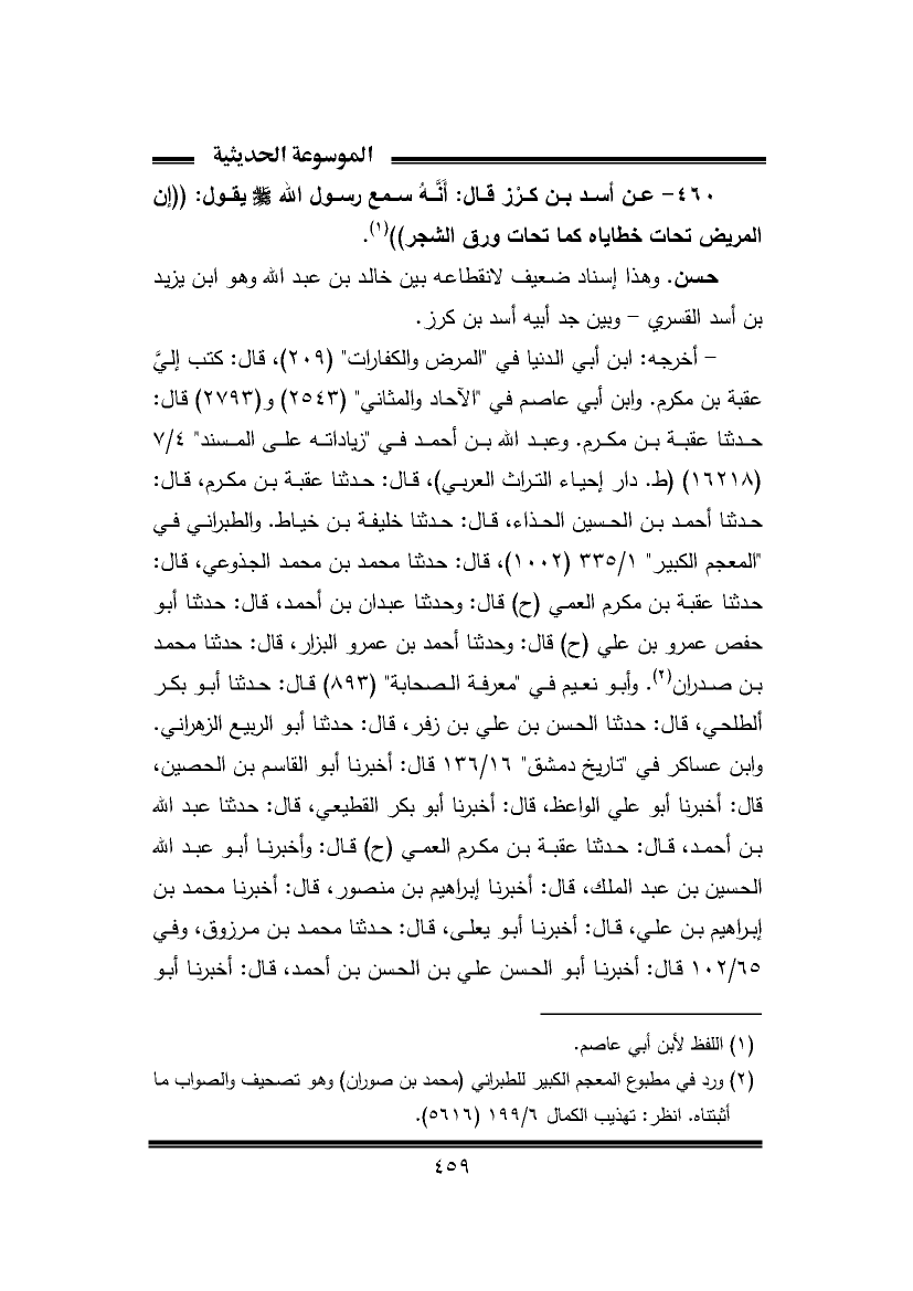 ٤٦٠ - عن أسد بن كرْز قال: أَنَّهُ سمع رسول الله -صَلَّى اللهُ عَلَيْهِ وَسَلَّمَ- يقول: ((إن المريض تحات خطاياه كما تحات ورق الشجر)) (¬١).