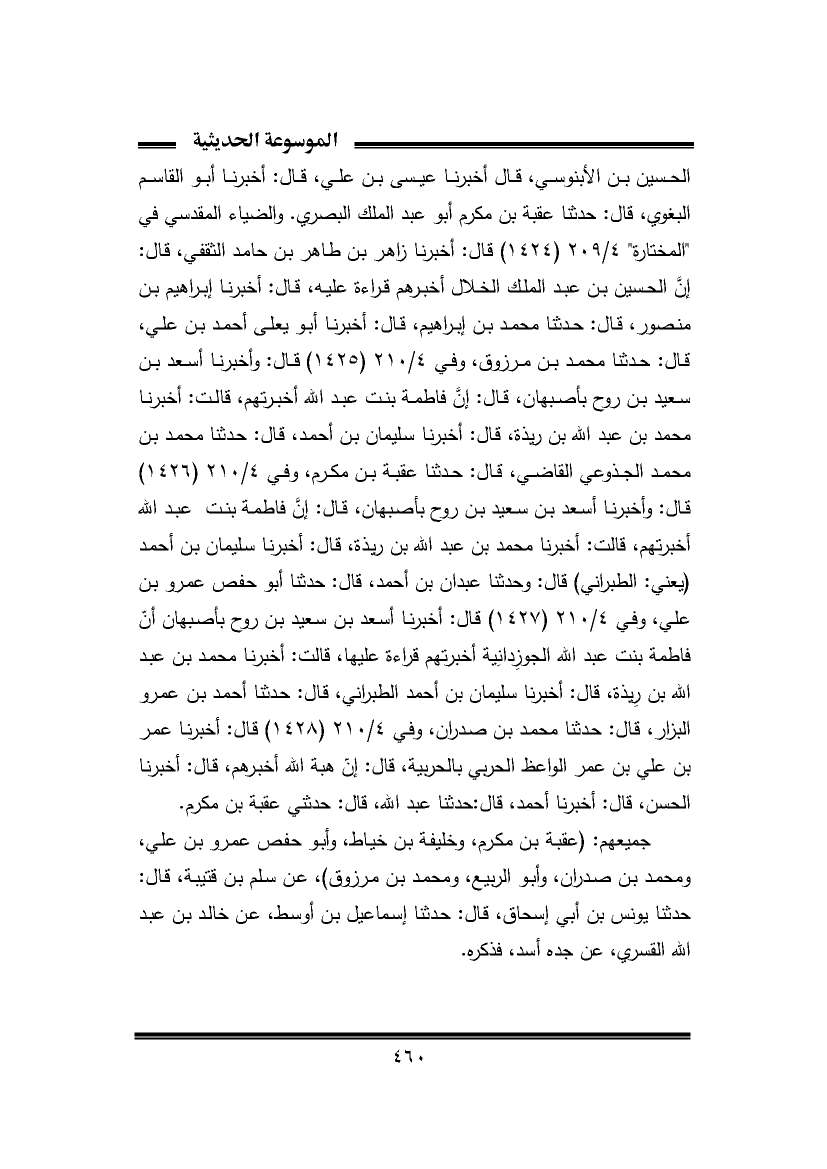 الحسين بن الأبنوسي، قال أخبرنا عيسى بن علي، قال: أخبرنا أبو القاسم البغوي، قال: حدثنا عقبة بن مكرم أبو عبد الملك البصري. والضياء المقدسي في "المختارة" ٤/ ٢٠٩ (١٤٢٤) قال: أخبرنا زاهر بن طاهر بن حامد الثقفي، قال: إنَّ الحسين بن عبد الملك الخلال أخبرهم قراءة عليه، قال: أخبرنا إبراهيم بن منصور، قال: حدثنا محمد بن إبراهيم، قال: أخبرنا أبو يعلى أحمد بن علي، قال: حدثنا محمد بن مرزوق، وفي ٤/ ٢١٠ (١٤٢٥) قال: وأخبرنا أسعد بن سعيد بن روح بأصبهان، قال: إنَّ فاطمة بنت عبد الله أخبرتهم، قالت: أخبرنا محمد بن عبد الله بن ريذة، قال: أخبرنا سليمان بن أحمد، قال: حدثنا محمد بن محمد الجذوعي القاضي، قال: حدثنا عقبة بن مكرم، وفي ٤/ ٢١٠ (١٤٢٦) قال: وأخبرنا أسعد بن سعيد بن روح بأصبهان، قال: إنَّ فاطمة بنت عبد الله أخبرتهم، قالت: أخبرنا محمد بن عبد الله بن ريذة، قال: أخبرنا سليمان بن أحمد (يعني: الطَّبراني) قال: وحدثنا عبدان بن أحمد، قال: حدثنا أبو حفص عمرو بن علي، وفي ٤/ ٢١٠ (١٤٢٧) قال: أخبرنا أسعد بن سعيد بن روح بأصبهان أنّ فاطمة بنت عبد الله الجوزدانِية أخبرتهم قراءة عليها، قالت: أخبرنا محمد بن عبد الله بن رِيذة، قال: أخبرنا سليمان بن أحمد الطَّبراني، قال: حدثنا أحمد بن عمرو البزار، قال: حدثنا محمد بن صدران، وفي ٤/ ٢١٠ (١٤٢٨) قال: أخبرنا عمر بن علي بن عمر الواعظ الحربي بالحربية، قال: إنّ هبة الله أخبرهم، قال: أخبرنا الحسن، قال: أخبرنا أحمد، قال: حدثنا عبد الله، قال: حدثني عقبة بن مكرم.