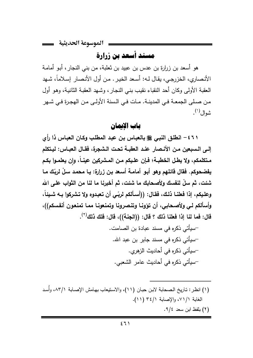 ٤٦١ - انطلق النَّبِيّ -صَلَّى اللهُ عَلَيْهِ وَسَلَّمَ- بالعباس بن عبد المطلب وكان العباس ذا رأي إلى السبعين من الأنصار عند العقبة تحت الشجرة، فقال العباس: ليتكلم متكلمكم، ولا يطل الخطبة؛ فإن عليكم من المشركين عينًا، وإن يعلموا بكم يفضحوكم. فقال قائلهم وهو أبو أمامة أسعد بن زرارة: يا محمد سلْ لربّك ما شئت، ثم سلْ لنفسك ولأصحابك ما شئت، ثم أخبرنا ما لنا من الثواب على الله وعليكم، إذا فعلنا ذلك، فقال: ((أسألكم لربّي أن تعبدوه ولا تشركوا به شيئًا، وأسألكم لي ولأصحابي، أن تؤونا وتنصرونا وتمنعونا مما تمنعون أنفسكم))، قال: فما لنا إذا فعلنا ذلك؟ قال: ((الجنة))، قال: فلك ذلك (¬٢).