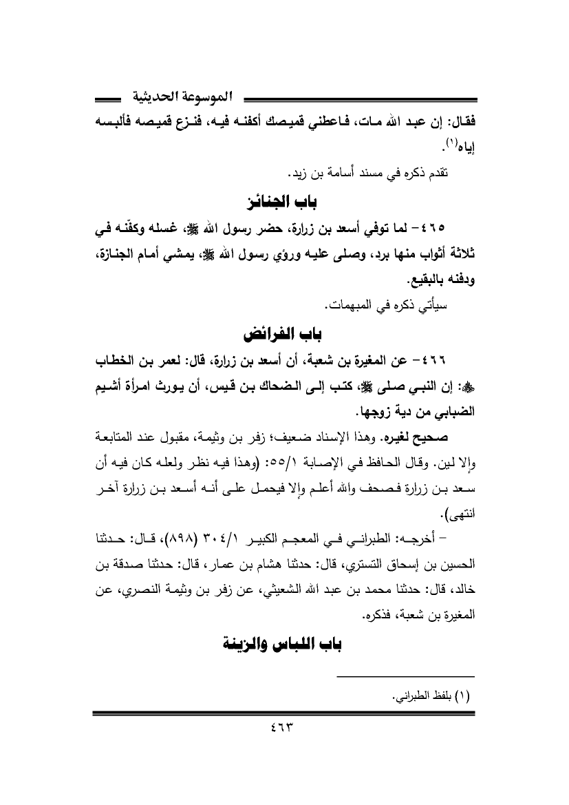٤٦٦ - عن المغيرة بن شعبة، أن أسعد بن زرارة، قال: لعمر بن الخطاب -رَضِيَ اللهُ عَنْهُم-: إن النَّبِيّ -صَلَّى اللهُ عَلَيْهِ وَسَلَّمَ-، كتب إلى الضحاك بن قيس، أن يورث امرأة أشيم الضبابي من دية زوجها.