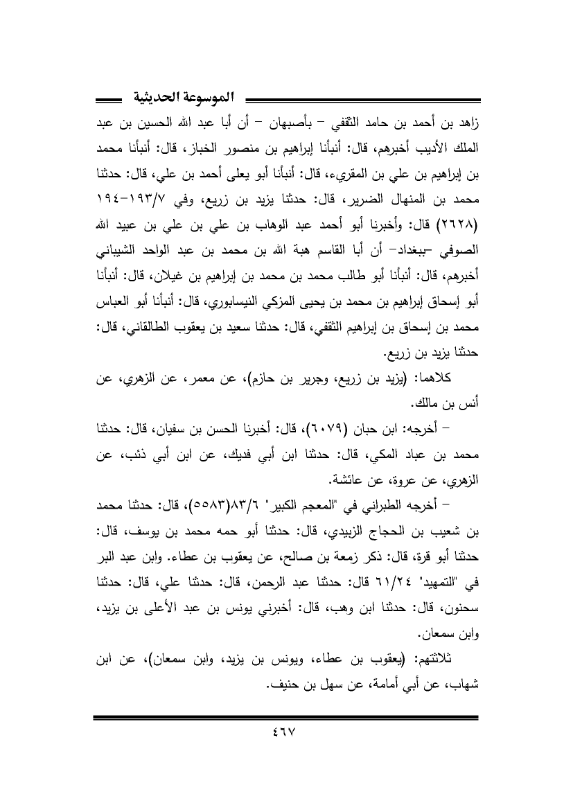 زاهد بن أحمد بن حامد الثقفي -بأصبهان- أن أبا عبد الله الحسين بن عبد الملك الأديب أخبرهم، قال: أنبأنا إبراهيم بن منصور الخباز، قال: أنبأنا محمد بن إبراهيم بن علي بن المقريء، قال: أنبأنا أبو يعلى أحمد بن علي، قال: حدثنا محمد بن المنهال الضرير، قال: حدثنا يزيد بن زريع، وفي ٧/ ١٩٣ - ١٩٤ (٢٦٢٨) قال: وأخبرنا أبو أحمد عبد الوهاب بن علي بن علي بن عبيد الله الصوفي -بغداد- أن أبا القاسم هبة الله بن محمد بن عبد الواحد الشيباني أخبرهم، قال: أنبأنا أبو طالب محمد بن محمد بن إبراهيم بن غيلان، قال: أنبأنا أبو إسحاق إبراهيم بن محمد بن يحيى المزكي النيسابوري، قال: أنبأنا أبو العباس محمد بن إسحاق بن إبراهيم الثقفي، قال: حدثنا سعيد بن يعقوب الطالقاني، قال: حدثنا يزيد بن زريع.