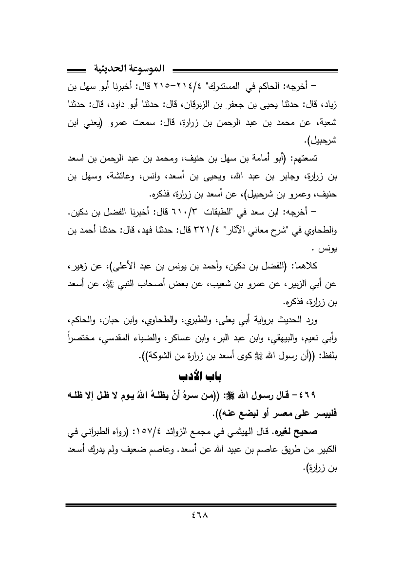 تسعتهم: (أبو أمامة بن سهل بن حنيف، ومحمد بن عبد الرحمن بن أسعد بن زرارة، وجابر بن عبد الله، ويحيى بن أسعد، وأنس، وعائشة، وسهل بن حنيف، وعمرو بن شرحبيل)، عن أسعد بن زرارة، فذكره.
