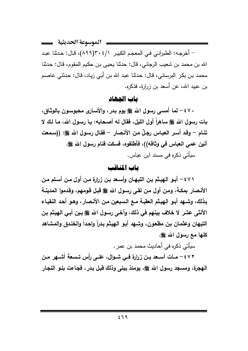 ٤٧١ - أبو الهيثم بن التيهان وأسعد بن زرارة من أول من أسلم من الأنصار بمكة، ومن أول من لقى رسول الله -صَلَّى اللهُ عَلَيْهِ وَسَلَّمَ- قبل قومهم، وقدموا المدينة بذلك، وشهد أبو الهيثم العقبة مع السبعين من الأنصار، وهو أحد النقباء الاثنى عشر لا خلاف بينهم في ذلك، وآخى رسول الله -صَلَّى اللهُ عَلَيْهِ وَسَلَّمَ- بين أبي الهيثم بن التيهان وعثمان بن مظعون، وشهد أبو الهيثم بدرًا وأحدًا والخندق والمشاهد كلها مع رسول الله -صَلَّى اللهُ عَلَيْهِ وَسَلَّمَ-.