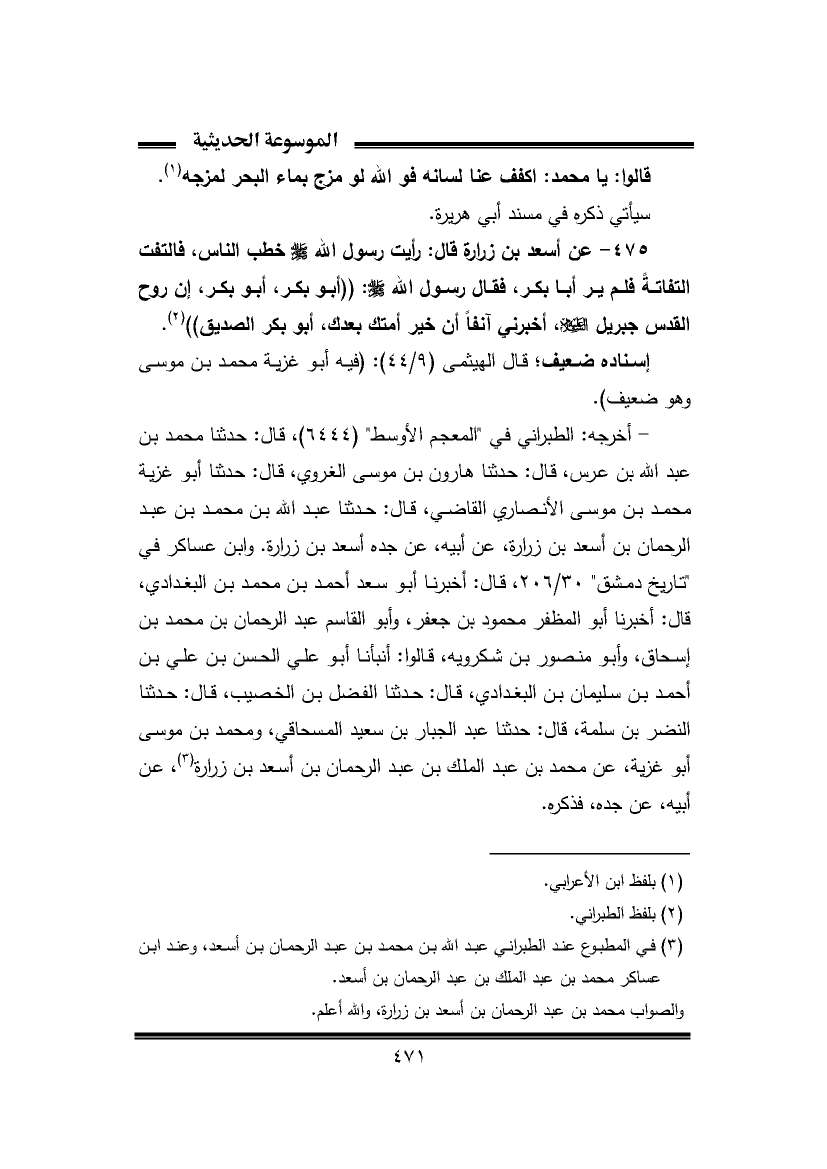 ٤٧٥ - عن أسعد بن زرارة قال: رأيت رسول الله -صَلَّى اللهُ عَلَيْهِ وَسَلَّمَ- خطب الناس، فالتفت التفاتةً فلم ير أبا بكر، فقال رسول الله -صَلَّى اللهُ عَلَيْهِ وَسَلَّمَ-: ((أبو بكر، أبو بكر، إن روح القدس جبريل -عَلَيْهِ السَّلَام-، أخبرني آنفًا أن خير أمتك بعدك، أبو بكر الصديق)) (¬٢).