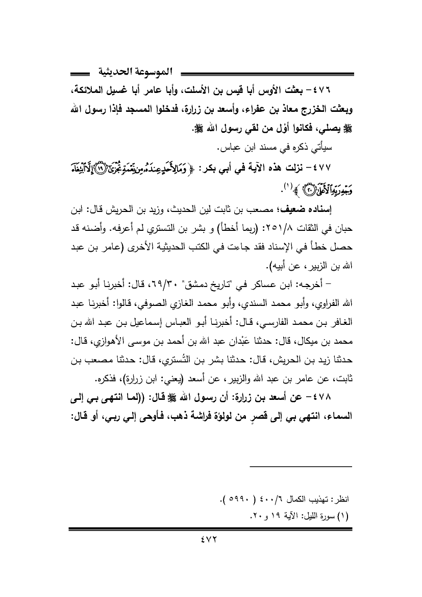 ٤٧٦ - بعثت الأوس أبا قيس بن الأسلت، وأبا عامر أبا غسيل الملائكة، وبعثت الخزرج معاذ بن عفراء، وأسعد بن زرارة، فدخلوا المسجد فإذا رسول الله -صَلَّى اللهُ عَلَيْهِ وَسَلَّمَ- يصلي، فكانوا أول من لقي رسول الله -صَلَّى اللهُ عَلَيْهِ وَسَلَّمَ-.
