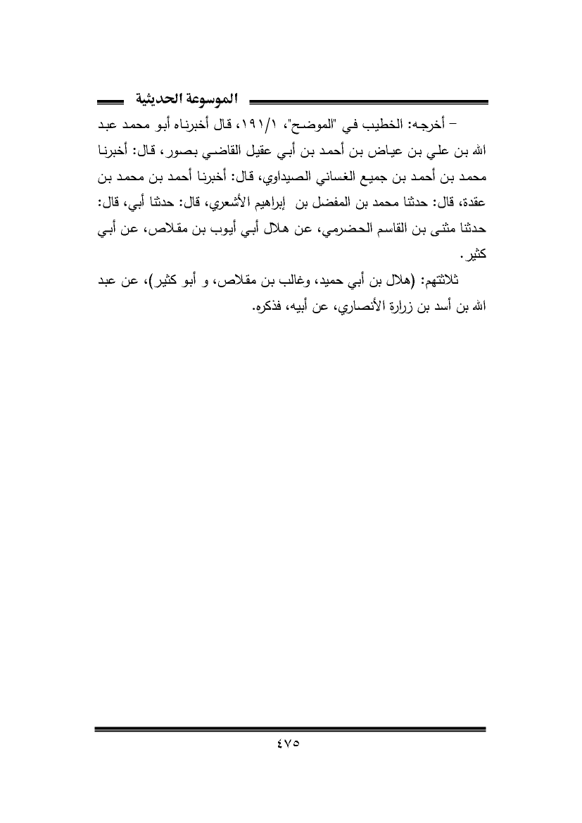- أخرجه: الخطيب في "الموضح"، ١/ ١٩١، قال أخبرناه أبو محمد عبد الله بن علي بن عياض بن أحمد بن أبي عقيل القاضي بصور، قال: أخبرنا محمد بن أحمد بن جميع الغساني الصيداوي، قال: أخبرنا أحمد بن محمد بن عقدة، قال: حدثنا محمد بن المفضل بن إبراهيم الأشعري، قال: حدثنا أبي، قال: حدثنا مثنى بن القاسم الحضرمي، عن هلال أبي أيوب بن مقلاص، عن أبي كثير.