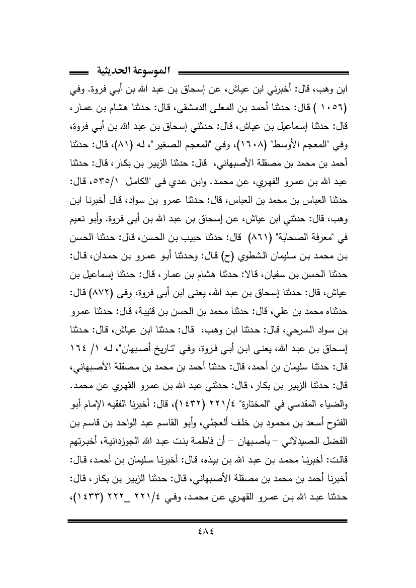 ابن وهب، قال: أخبرني ابن عياش، عن إسحاق بن عبد الله بن أبي فروة. وفي (١٠٥٦) قال: حدثنا أحمد بن المعلى الدمشقي، قال: حدثنا هشام بن عمار، قال: حدثنا إسماعيل بن عياش، قال: حدثني إسحاق بن عبد الله بن أبي فروة، وفي "المعجم الأوسط" (١٦٠٨)، وفي "المعجم الصغير"، له (٨١)، قال: حدثنا أحمد بن محمد بن مصقلة الأصبهاني، قال: حدثنا الزبير بن بكار، قال: حدثنا عبد الله بن عمرو الفهري، عن محمد. وابن عدي في "الكامل" ١/ ٥٣٥، قال: حدثنا العباس بن محمد بن العباس، قال: حدثنا عمرو بن سواد، قال أخبرنا ابن وهب، قال: حدثني ابن عياش، عن إسحاق بن عبد الله بن أبي فروة. وأبو نعيم في "معرفة الصحابة" (٨٦١) قال: حدثنا حبيب بن الحسن، قال: حدثنا الحسن بن محمد بن سليمان الشطوي (ح) قال: وحدثنا أبو عمرو بن حمدان، قال: حدثنا الحسن بن سفيان، قالا: حدثنا هشام بن عمار، قال: حدثنا إسماعيل بن عياش، قال: حدثنا إسحاق بن عبد الله، يعني ابن أبي فروة، وفي (٨٧٢) قال: حدثناه محمد بن علي، قال: حدثنا محمد بن الحسن بن قتيبة، قال: حدثنا عمرو بن سواد السرحي، قال: حدثنا ابن وهب، قال: حدثنا ابن عياش، قال: حدثنا إسحاق بن عبد الله، يعني ابن أبي فروة، وفي "تاريخ أصبهان"، له ١/ ١٦٤ قال: حدثنا سليمان بن أحمد، قال: حدثنا أحمد بن محمد بن مصقلة الأصبهاني، قال: حدثنا الزبير بن بكار، قال: حدثني عبد الله بن عمرو الفهري عن محمد. والضياء المقدسي في "المختارة" ٤/ ٢٢١ (١٤٣٢)، قال: أخبرنا الفقيه الإمام أبو الفتوح أسعد بن محمود بن خلف العجلي، وأبو القاسم عبد الواحد بن قاسم بن الفضل الصيدلاني -بأصبهان- أن فاطمة بنت عبد الله الجوزدانية، أخبرتهم قالت: أخبرنا محمد بن عبد الله بن بيذه، قال: أخبرنا سليمان بن أحمد، قال: أخبرنا أحمد بن محمد بن مصقلة الأصبهاني، قال: حدثنا الزبير بن بكار، قال: حدثنا عبد الله بن عمرو الفهري عن محمد، وفي ٤/ ٢٢١ - ٢٢٢ (١٤٣٣)،