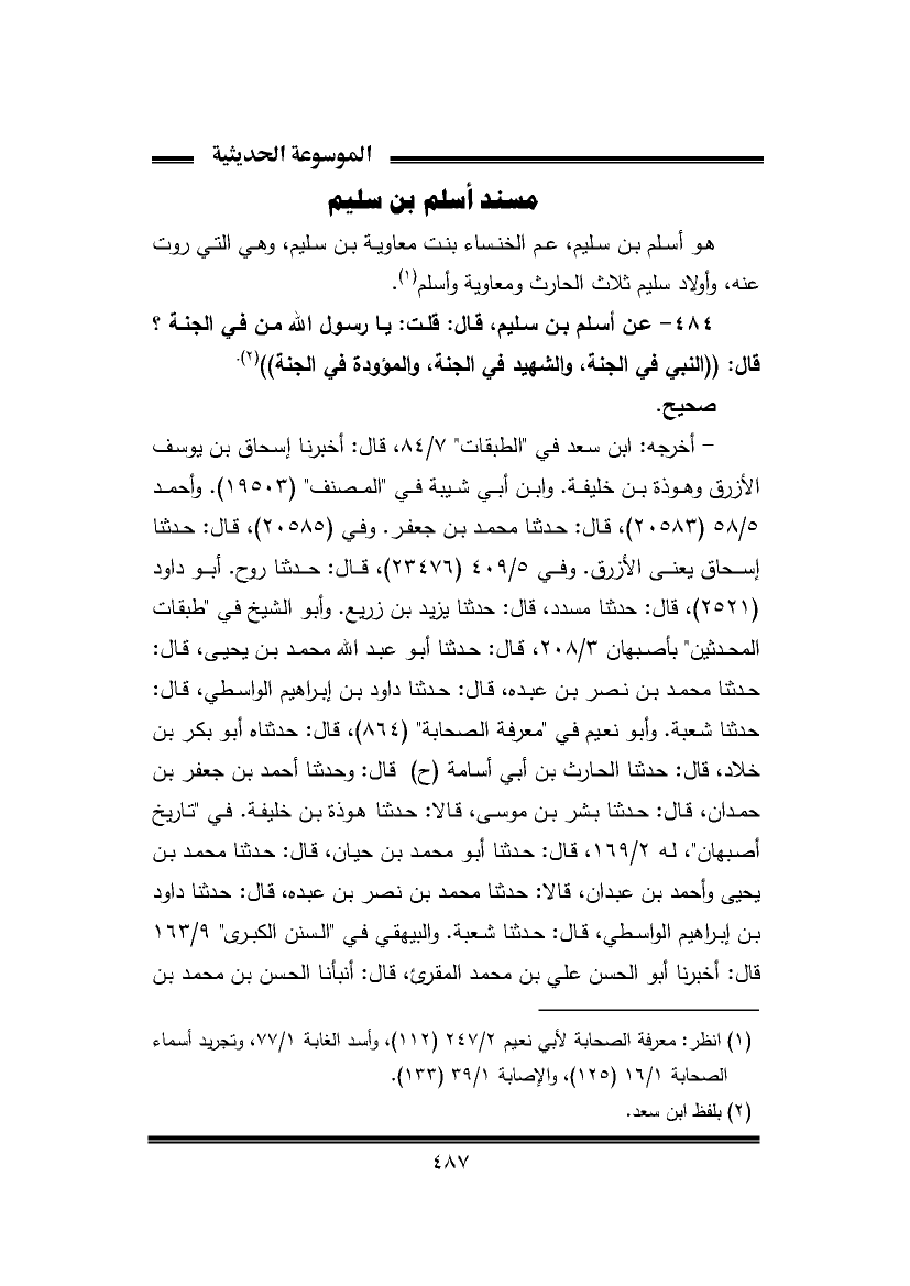 ٤٨٤ - عن أسلم بن سليم، قال: قلت: يا رسول الله من في الجنة؟ قال: ((النبي في الجنة، والشهيد في الجنة، والموؤدة في الجنة)) (¬٢).