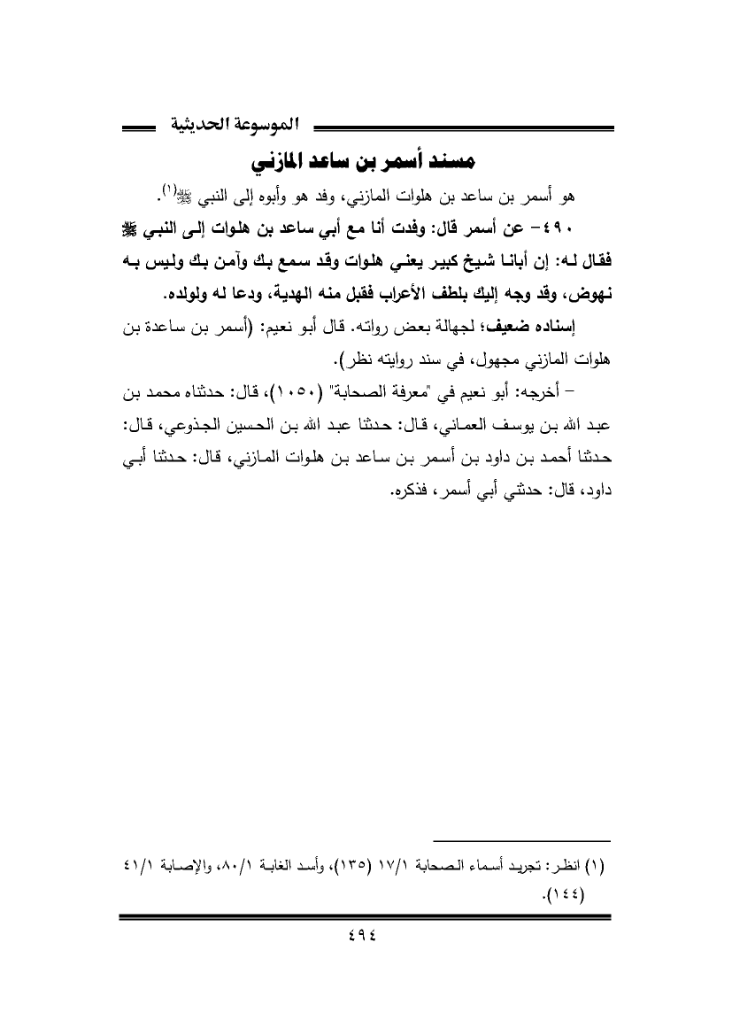 ٤٩٠ - عن أسمر قال: وفدت أنا مع أبي ساعد بن هلوات إلى النبي -صَلَّى اللهُ عَلَيْهِ وَسَلَّمَ- فقال له: إن أبانا شيخ كبير يعني هلوات وقد سمع بك وآمن بك وليس به نهوض، وقد وجه إليك بلطف الأعراب فقبل منه الهدية، ودعا له ولولده.
