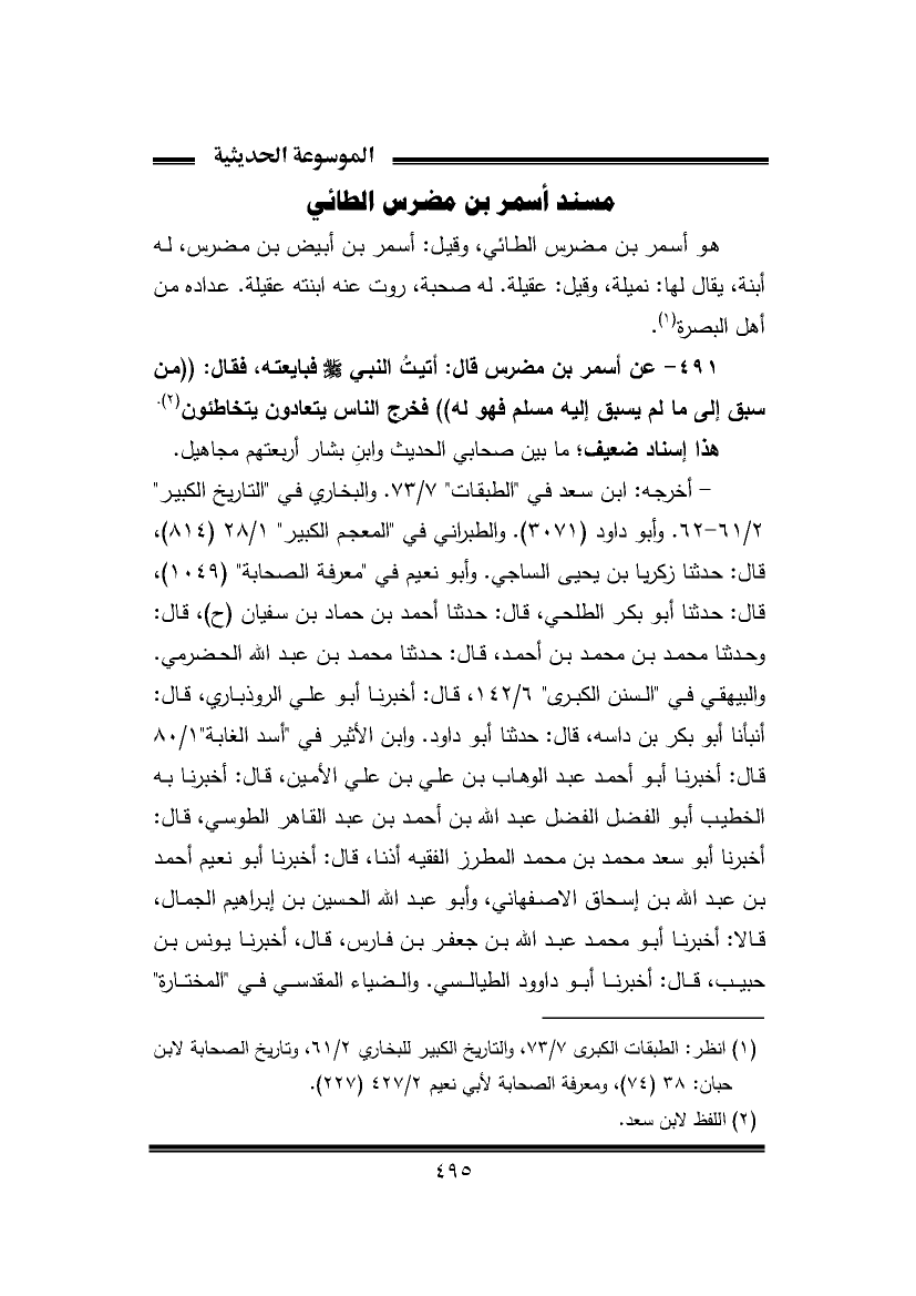 ٤٩١ - عن أسمر بن مضرس قال: أتيتُ النبي -صَلَّى اللهُ عَلَيْهِ وَسَلَّمَ- فبايعته، فقال: ((من سبق إلى ما لم يسبق إليه مسلم فهو له)) فخرج الناس يتعادون يتخاطئون (¬٢).