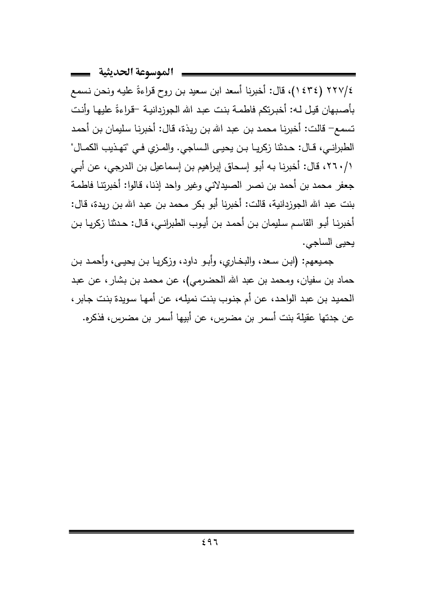 ٤/ ٢٢٧ - (١٤٣٤)، قال: أخبرنا أسعد ابن سعيد بن روح قراءةً عليه ونحن نسمع بأصبهان قيل له: أخبرتكم فاطمة بنت عبد الله الجوزدانية -قراءةً عليها وأنت تسمع- قالت: أخبرنا محمد بن عبد الله بن ريذة، قال: أخبرنا سليمان بن أحمد الطبراني، قال: حدثنا زكريا بن يحيى الساجي. والمزي في "تهذيب الكمال" ١/ ٢٦٠، قال: أخبرنا به أبو إسحاق إبراهيم بن إسماعيل بن الدرجي، عن أبي جعفر محمد بن أحمد بن نصر الصيدلاني وغير واحد إذنا، قالوا: أخبرتنا فاطمة بنت عبد الله الجوزدانية، قالت: أخبرنا أبو بكر محمد بن عبد الله بن ريدة، قال: أخبرنا أبو القاسم سليمان بن أحمد بن أيوب الطبراني، قال: حدثنا زكريا بن يحيى الساجي.