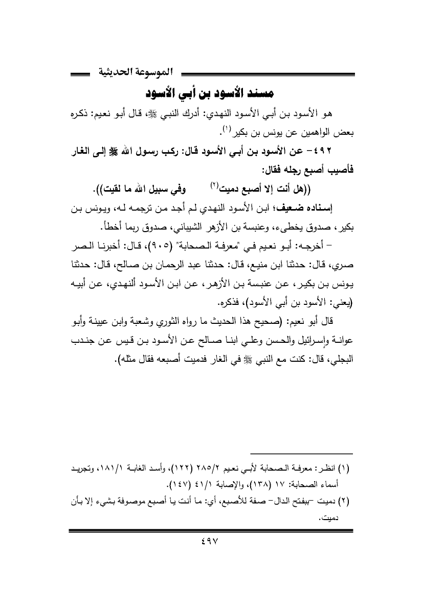 ٤٩٢ - عن الأسود بن أبي الأسود قال: ركب رسول الله -صَلَّى اللهُ عَلَيْهِ وَسَلَّمَ- إلى الغار فأصيب أصبع رجله فقال: